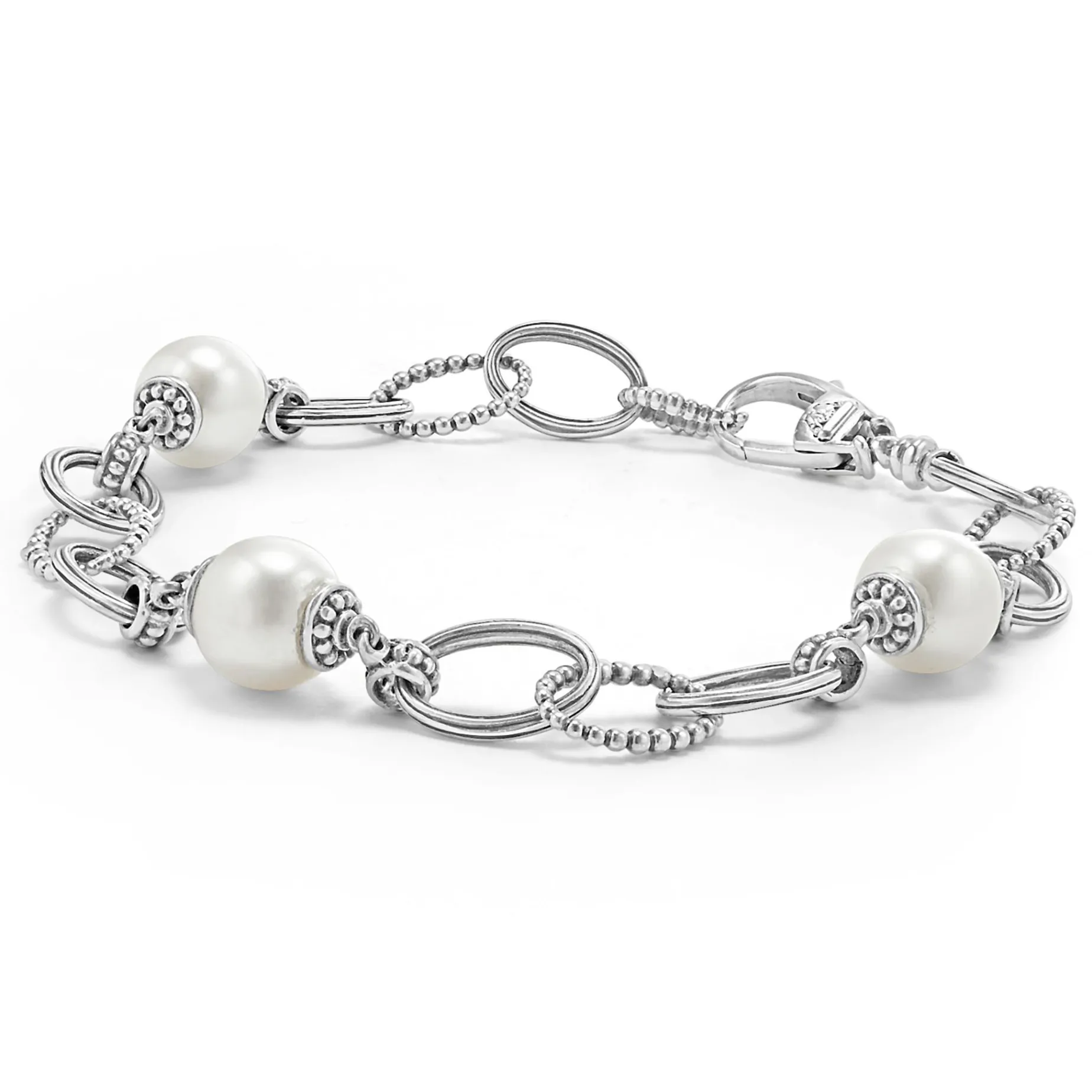 Three Cultured Freshwater Pearl Stations Accent This Sterling Silver Bracelet With Caviar Beaded Circle Link Accents.