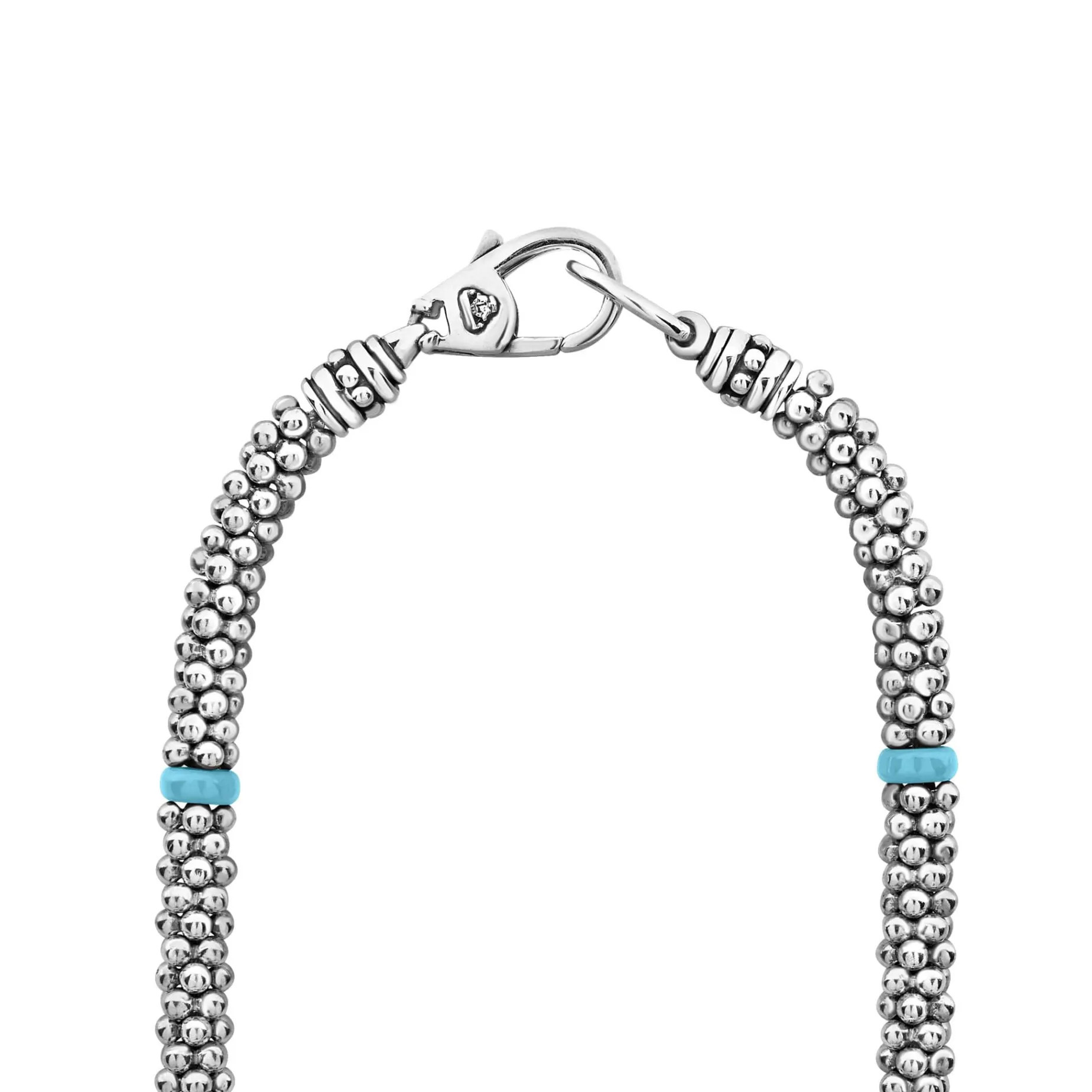 A Sterling Silver Caviar Beaded Necklace With 14 Blue Ceramic Stations.