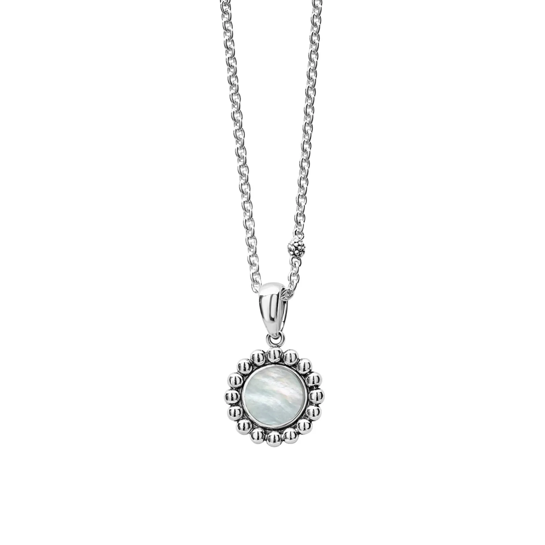 Mother Of Pearl Gemstone Pendant Framed By Sterling Silver Caviar Beading Finished On A Versatile Link Necklace With Six Sterling Silver Caviar Beaded Stations.
