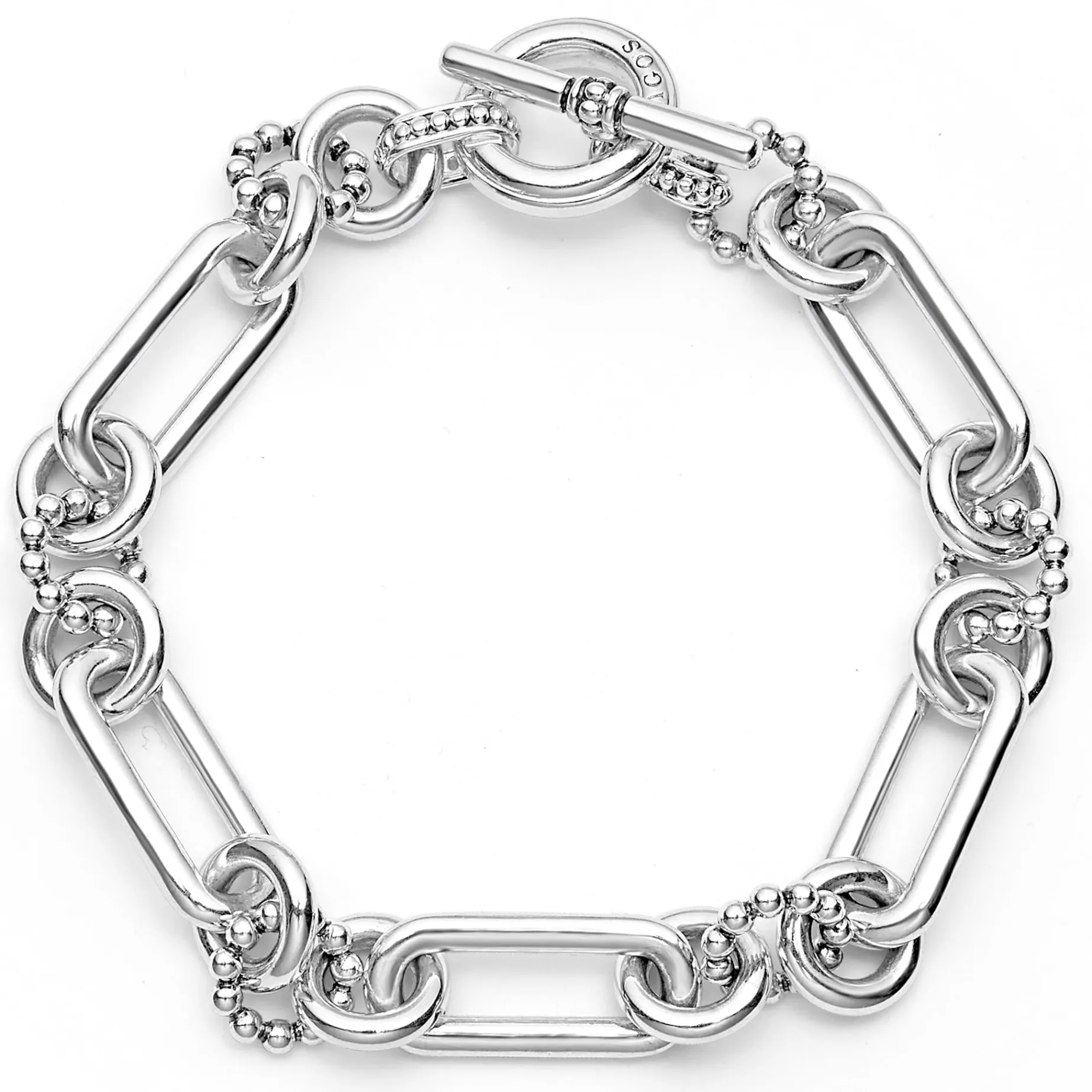 - One Bold Sterling Silver Link Bracelet Created From Variations Of Caviar Beading & Fluting Elements. Adjustable-Bar Fits Through Oval Links For Easy Sizing.