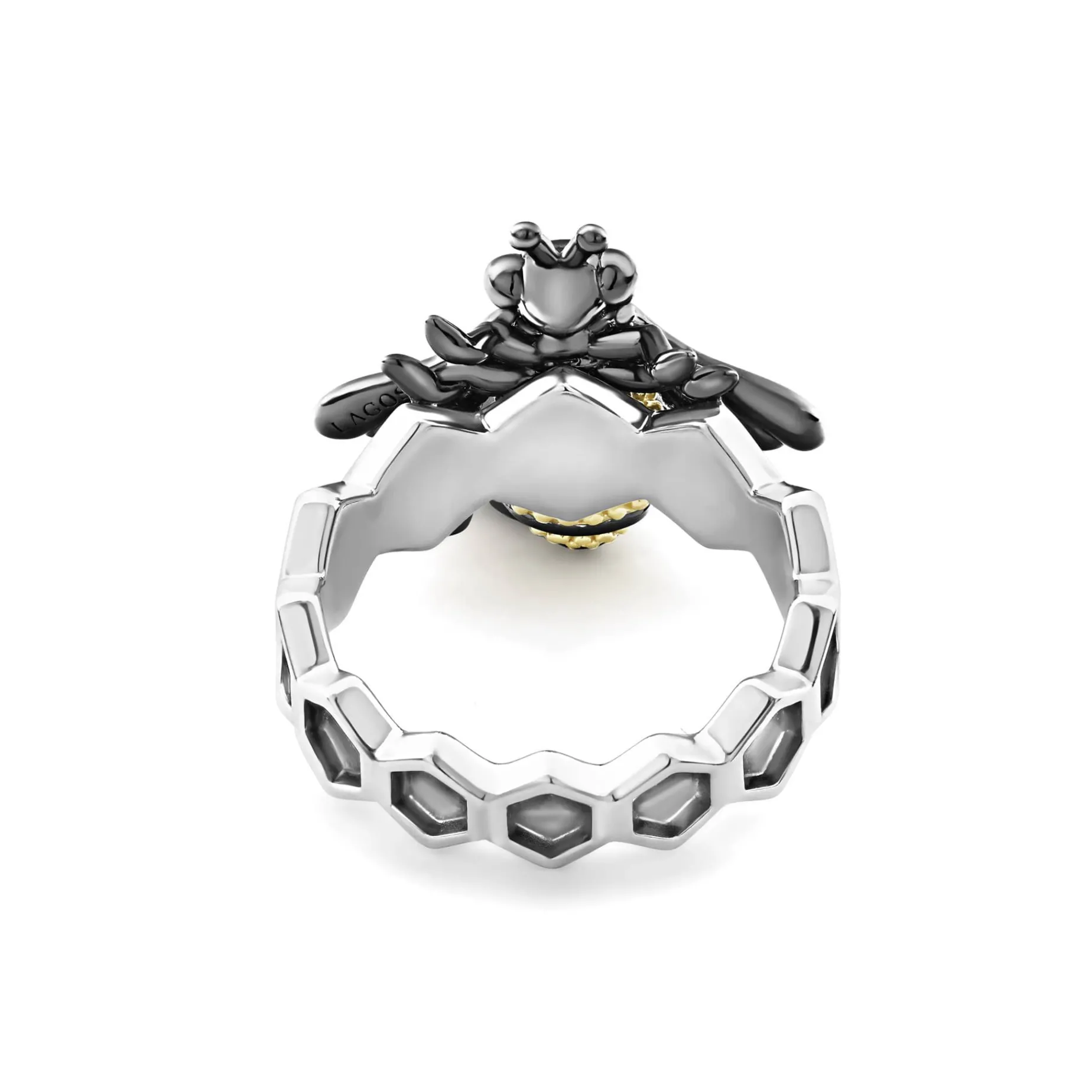 Honeybee Ring With 18K Gold Caviar Beading And Black Rhodium On Sterling Silver With A Honeycomb Band.