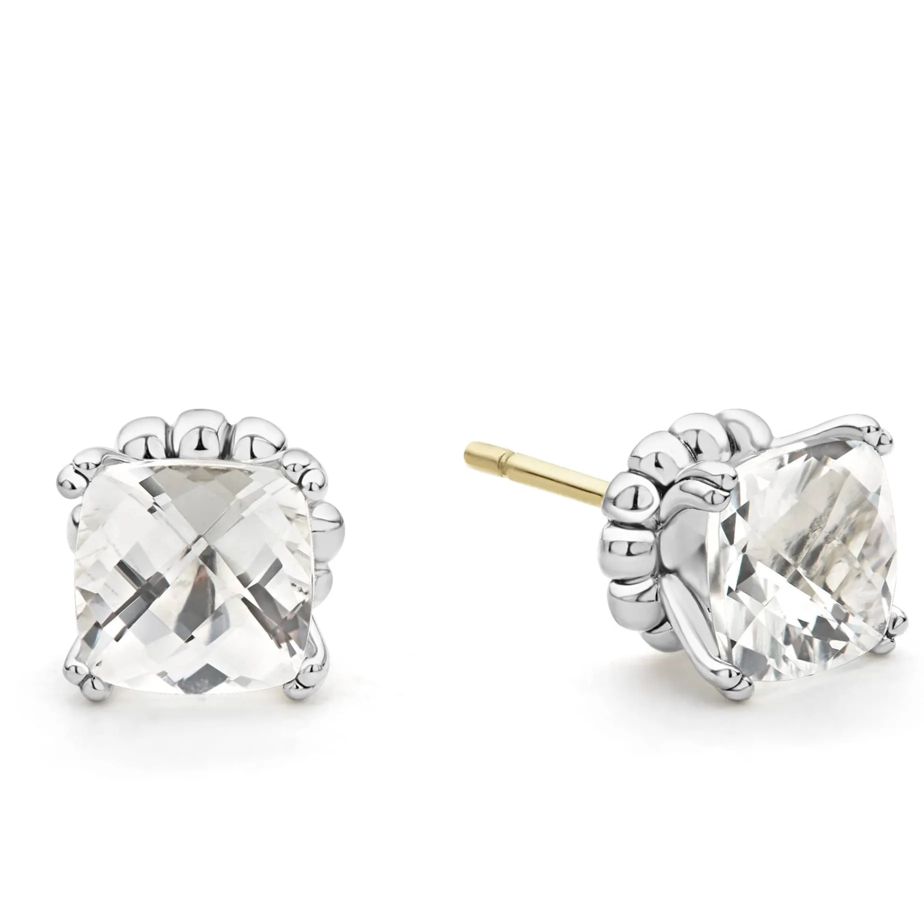 White Topaz Gemstones Form These Prong-Set, Cushion-Shape Stud Earrings With Harlequin Facets.