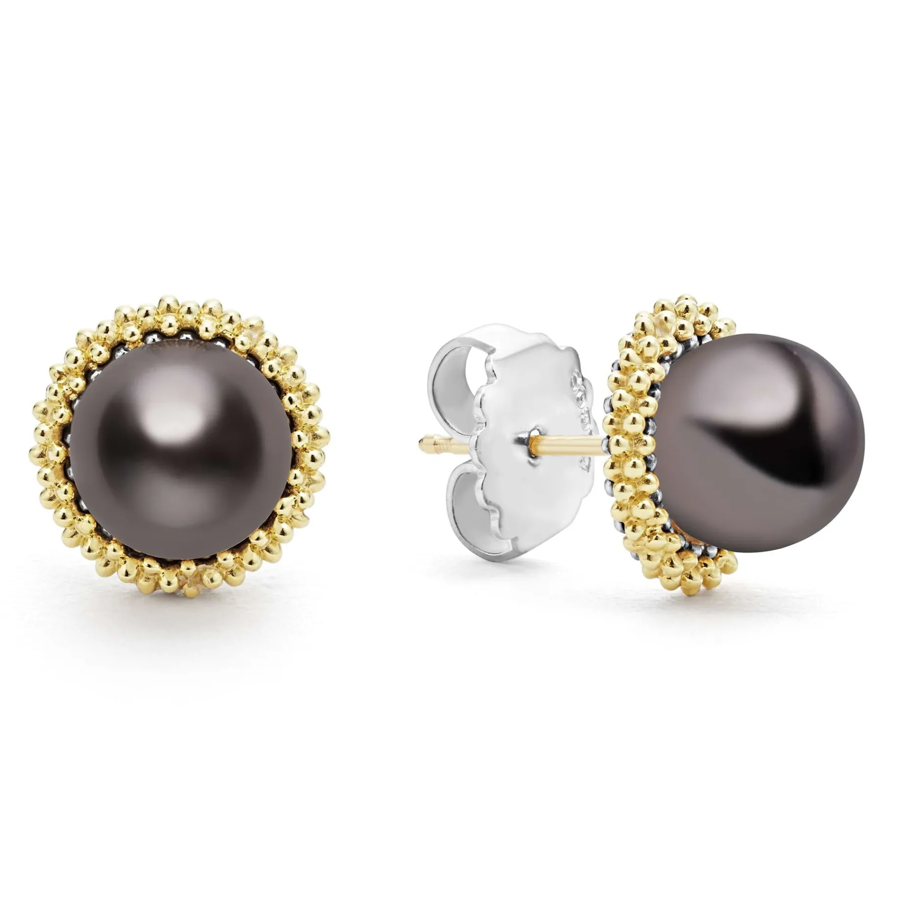 A Tahitian Black Pearl Stud Earrings Set In 18K Gold Caviar Beading. Just The Right Touch For Every Day.