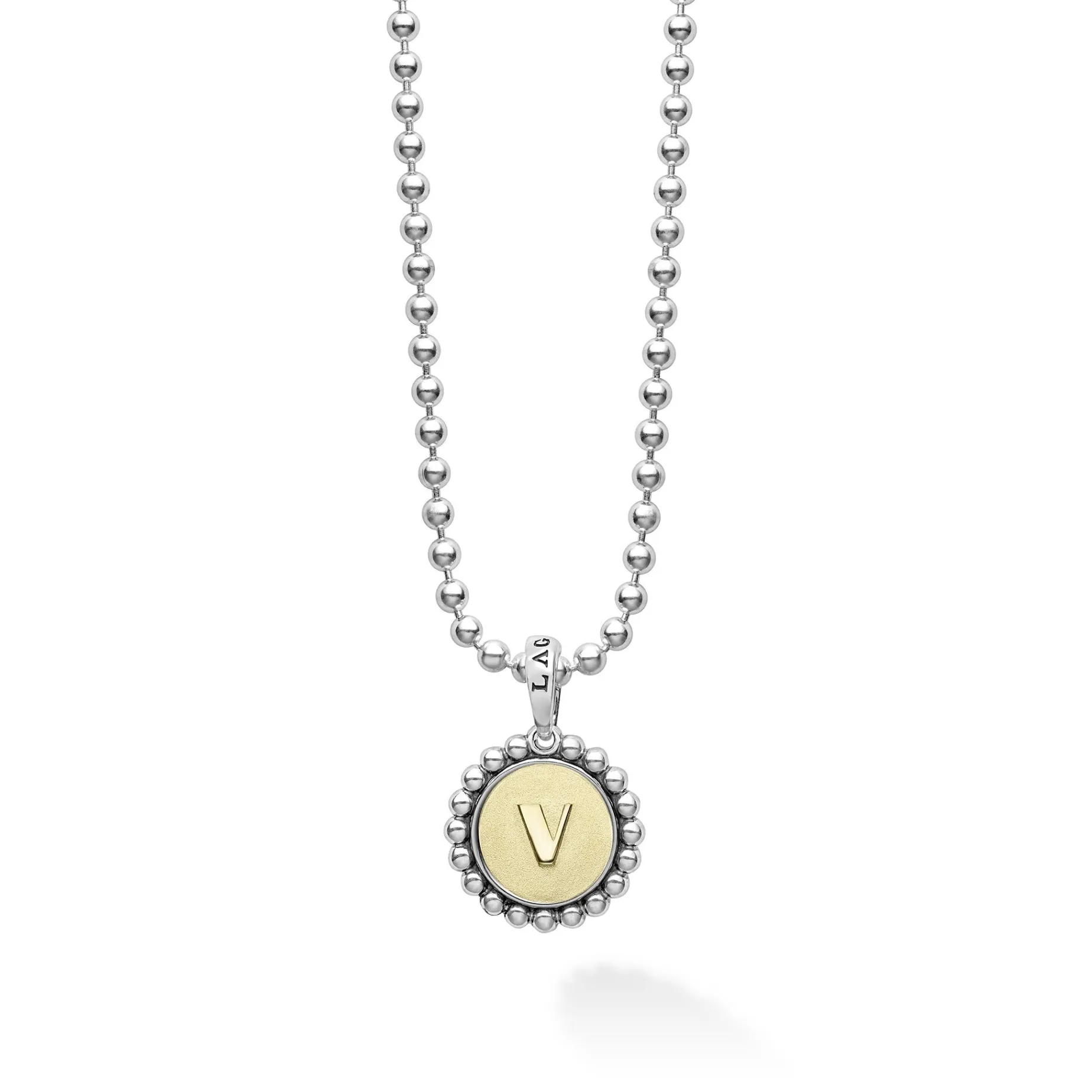 Our Signature Caviar Sterling Silver And 18K Gold Initial ‘V’ Charm Finished On A Sterling Silver Ball Chain Necklace.