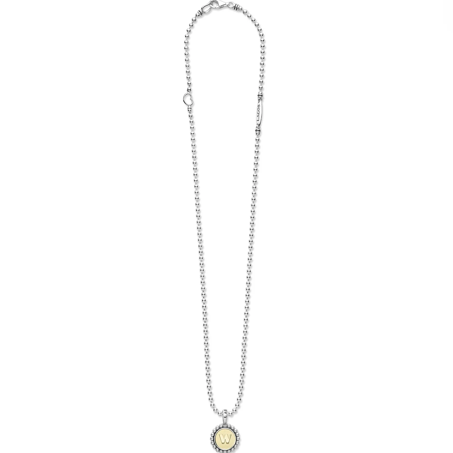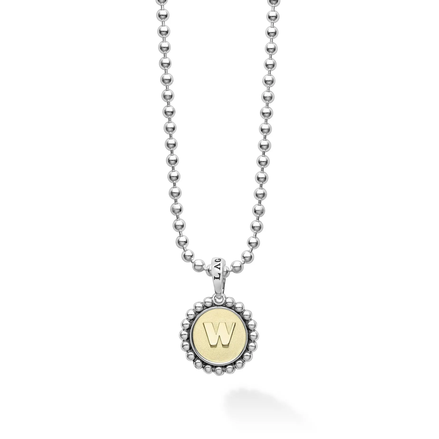 Our Signature Caviar Sterling Silver And 18K Gold Initial ‘W’ Charm Finished On A Sterling Silver Ball Chain Necklace.