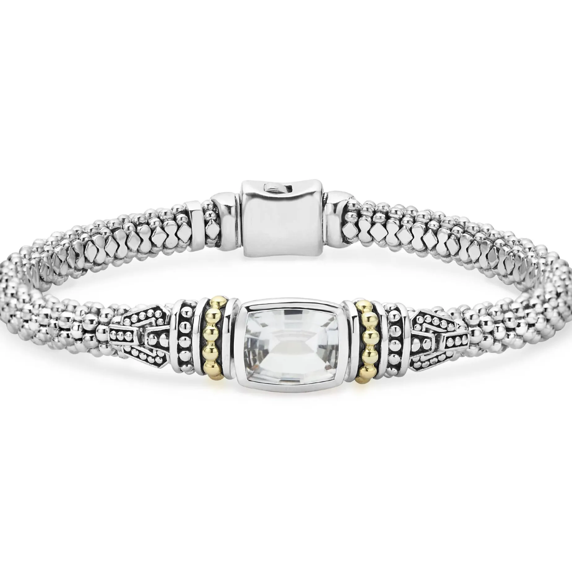 White Topaz Bezel-Set Gemstone And Sterling Silver Caviar Beading With 18K Gold Detailing Forms This Bracelet.