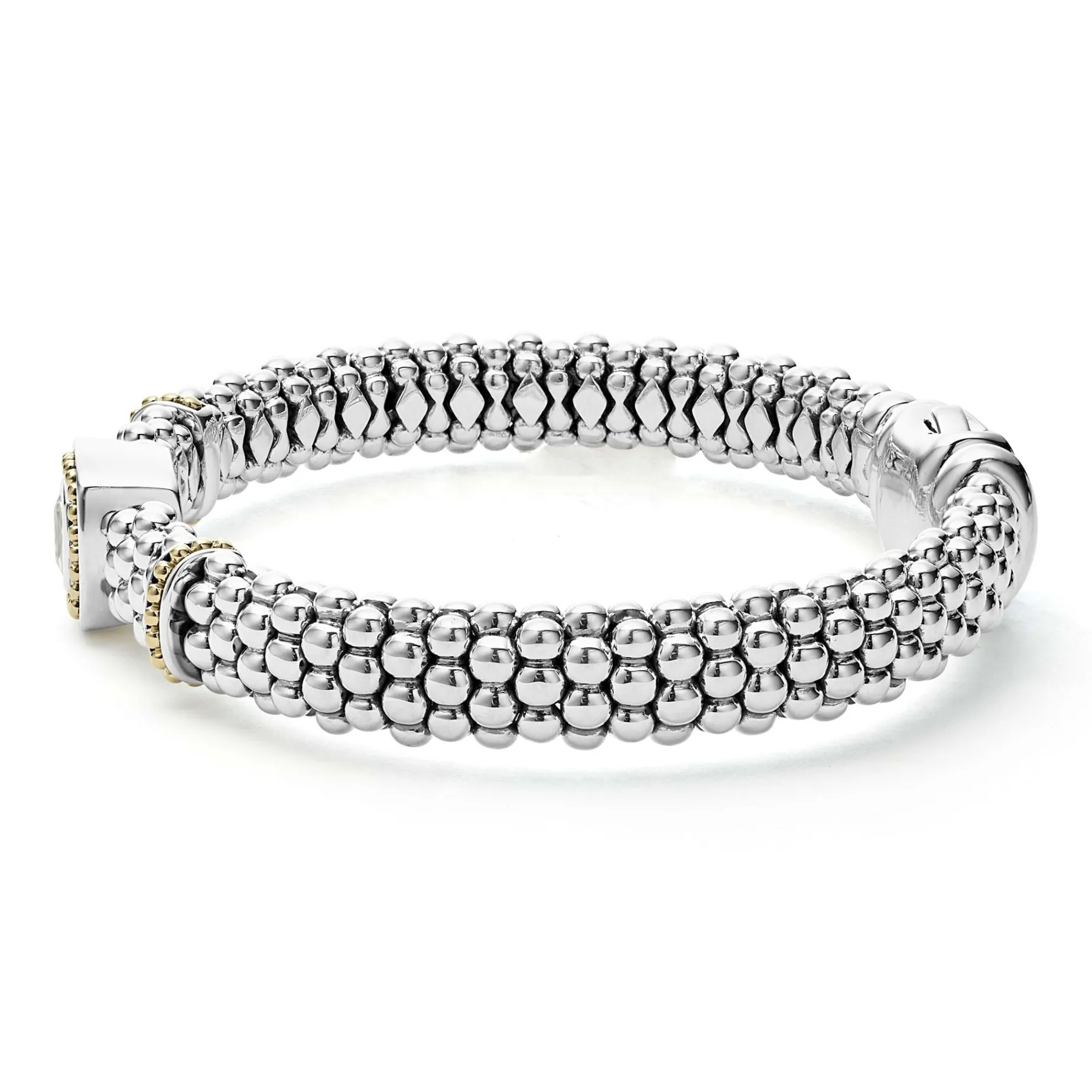 A White Topaz Gemstone And Sterling Silver Caviar Beading With 18K Gold Detailing Forms This Bracelet.