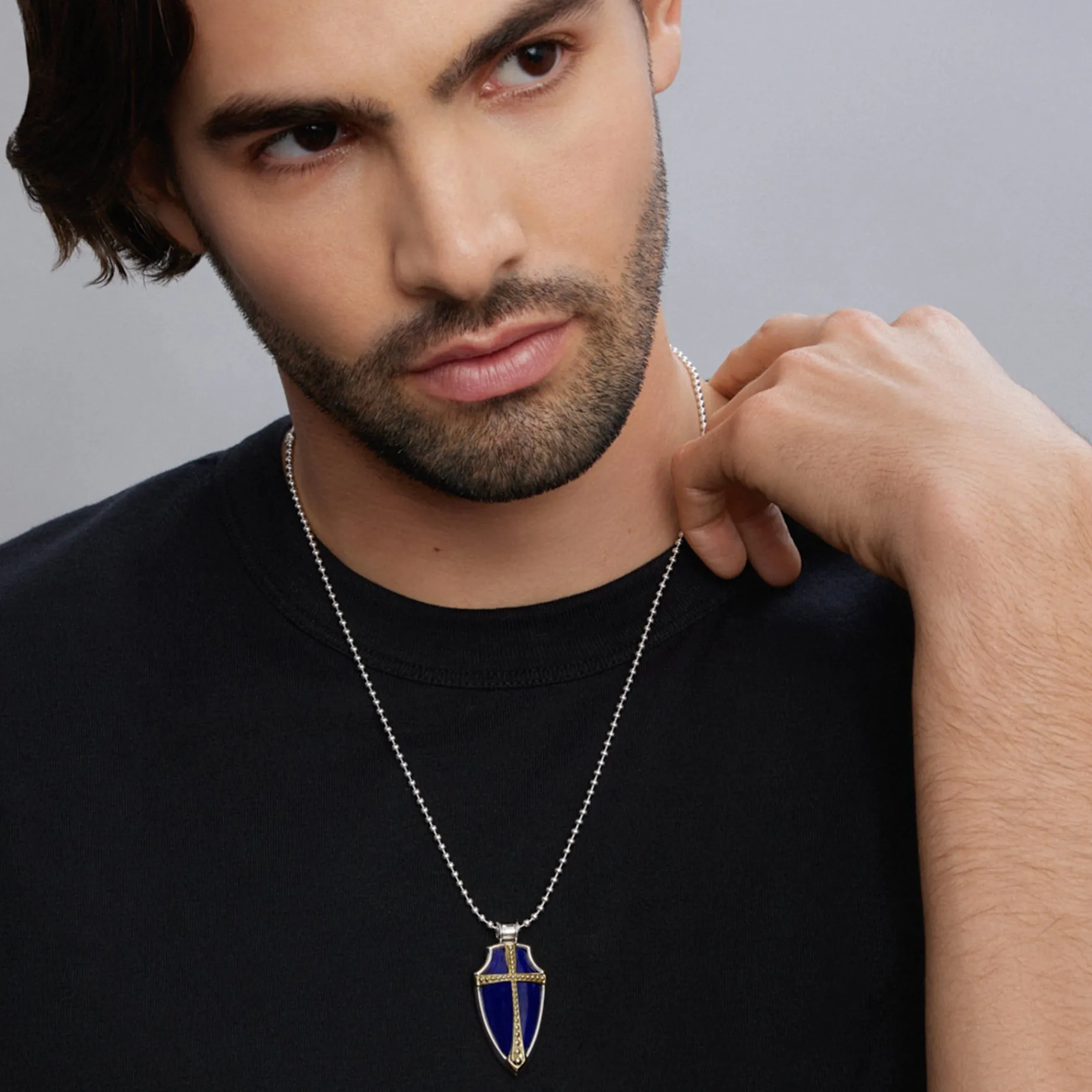 Lapis Gemstone Accented By Sterling Silver And 18K Gold Caviar Beading Form This Shield Amulet.