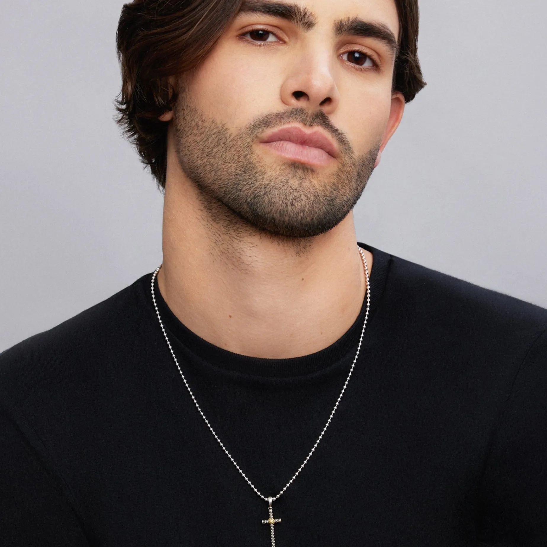 18K Gold And Sterling Silver Caviar Beading Form This Two Tone Cross Amulet. Finished On A Sterling Silver Ball Chain Necklace.