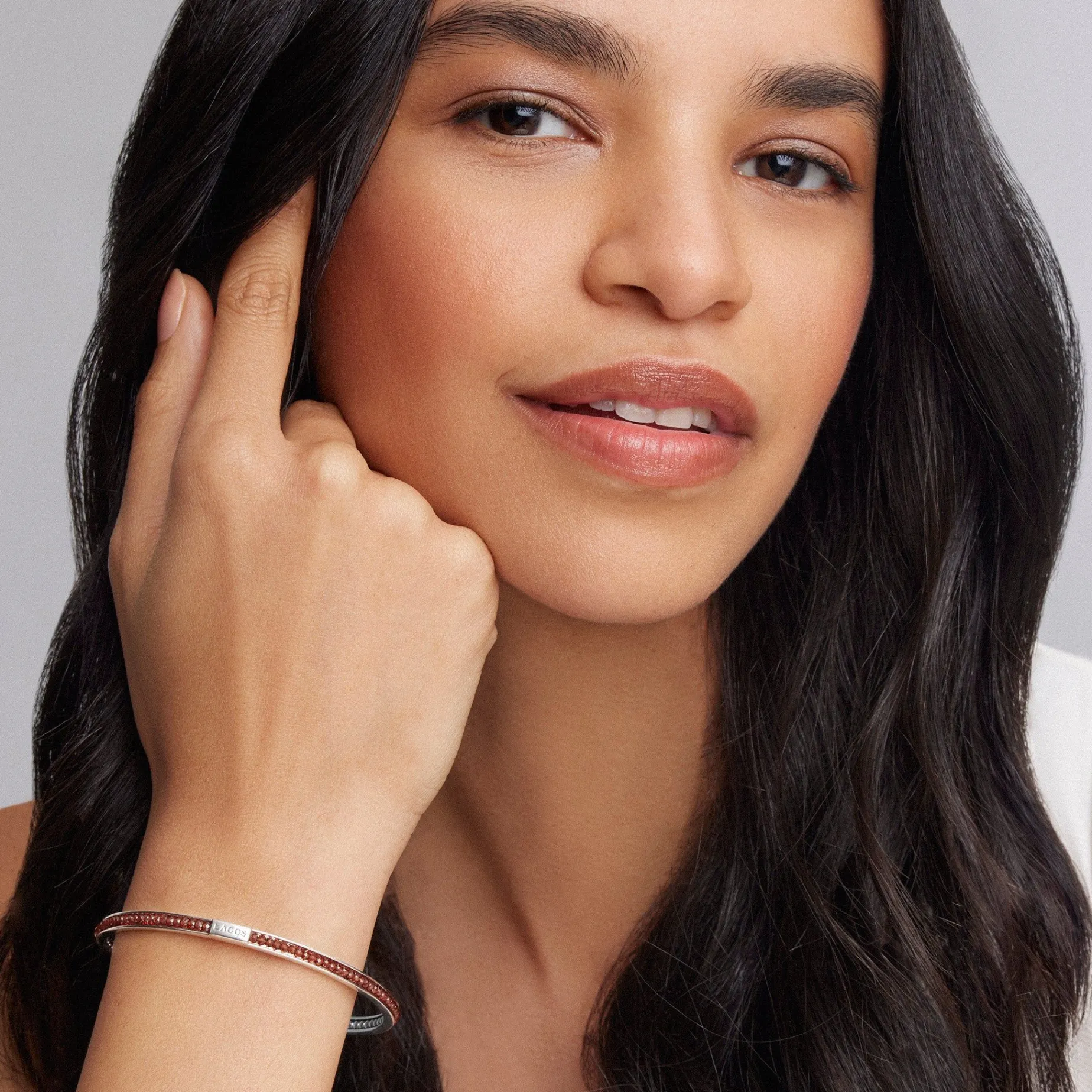Garnet Gemstones Set With Smoothly Polished Sterling Silver Forms This Round Bangle Detailing The Lagos Logo.