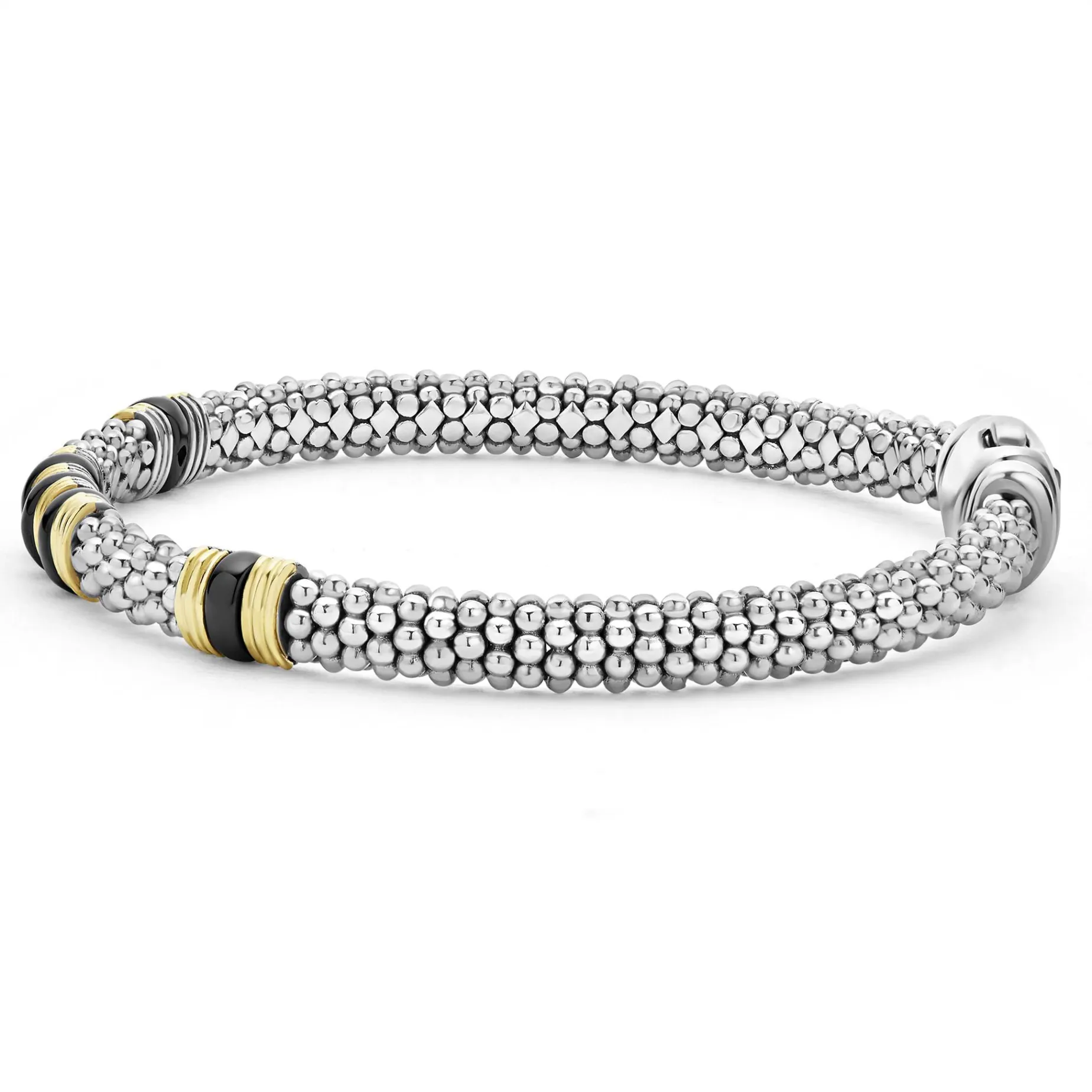 Three 18K Gold And Black Ceramic Stations Set In Sterling Silver Caviar Beading.