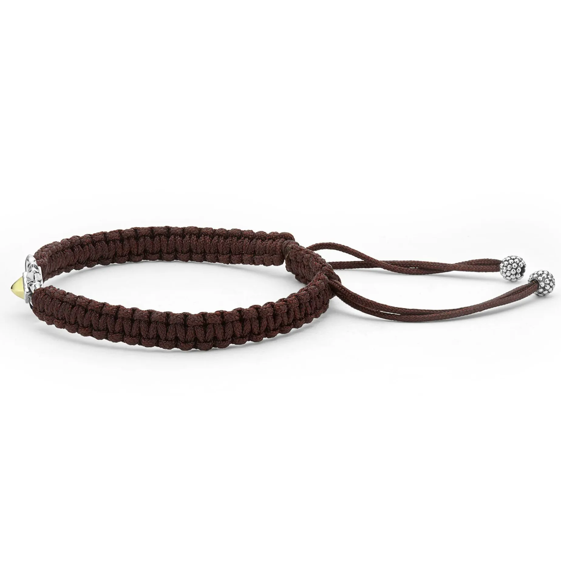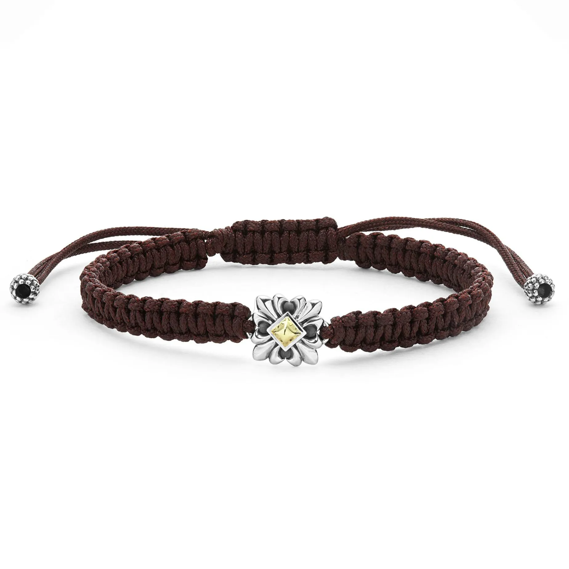 Brown Braided Nylon With A Sterling Silver And 18K Gold Medieval Motif Forms This Versatile Macrame Bracelet.
