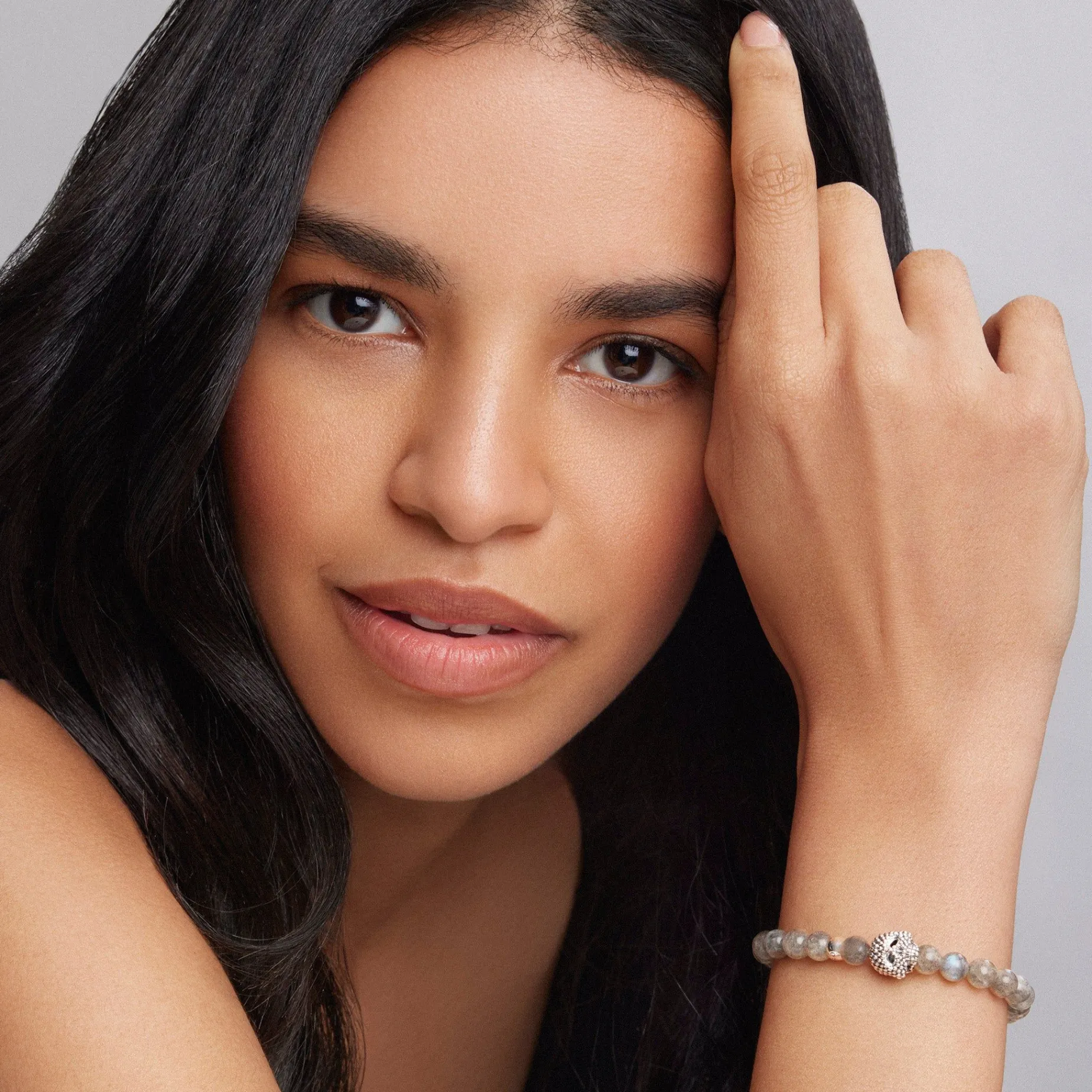 Labradorite Gemstone Beaded Bracelet With A Sterling Silver Caviar Skull.