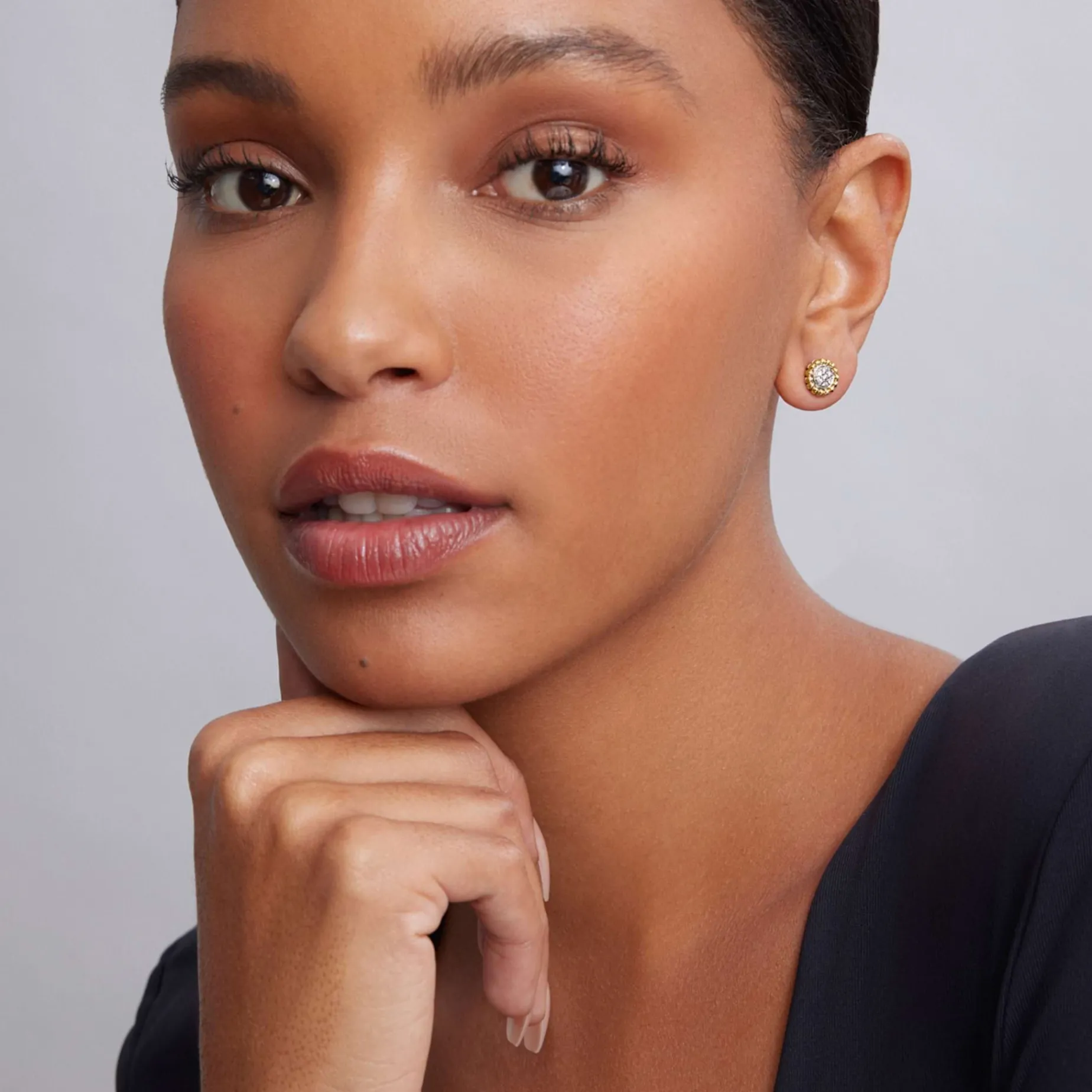 Pavé Diamond Circle Stud Earrings Framed By 18K Gold Caviar Beading. Lagos Diamonds Are The Highest Quality Natural Stones.