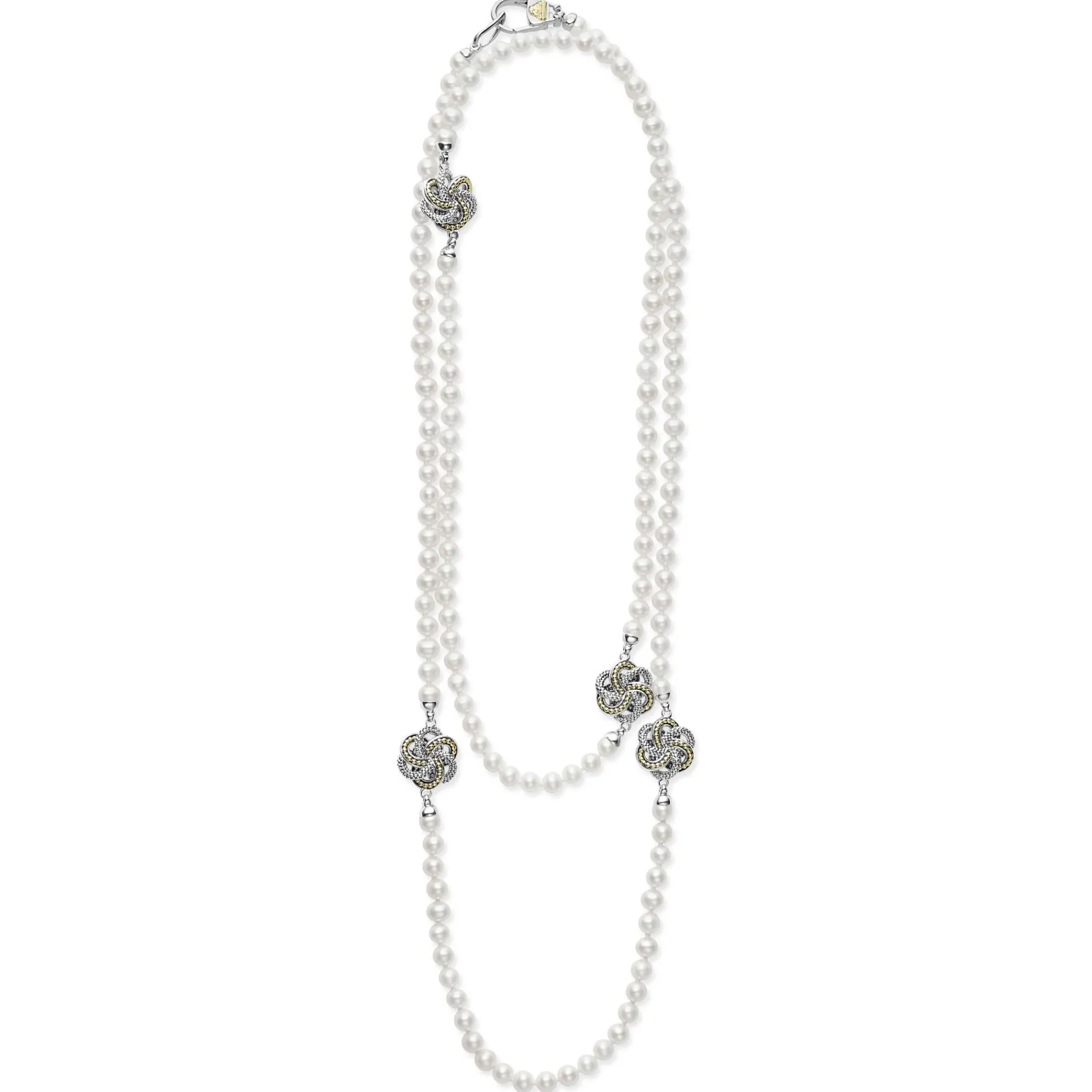 Five 18K Gold And Sterling Silver Love Knot Stations Accent This Necklace Of Cultured Freshwater Pearls.