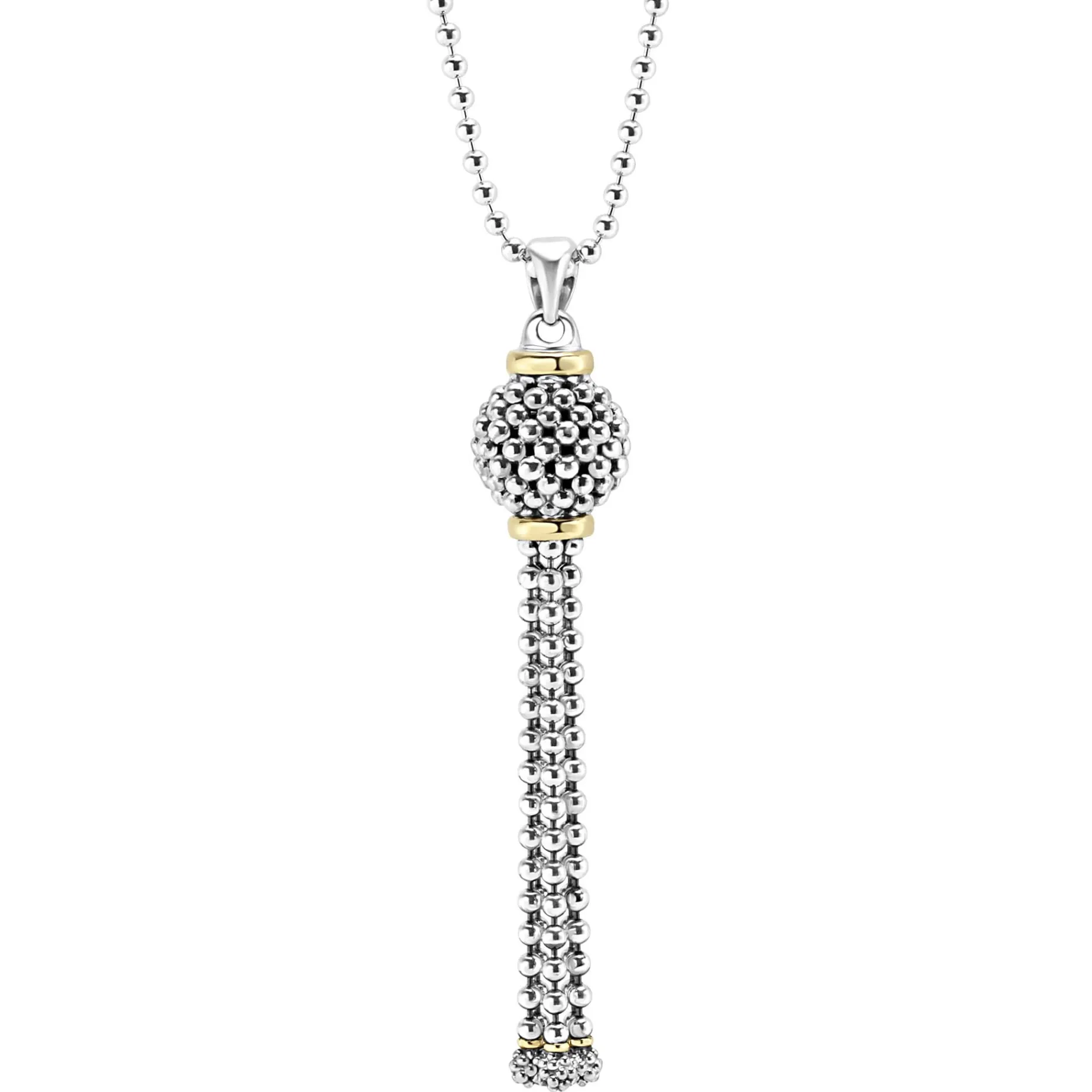 Caviar Tassel Pendant With 18K Gold And Sterling Silver On A Ball Chain Necklace Accented With Caviar Beaded Details.