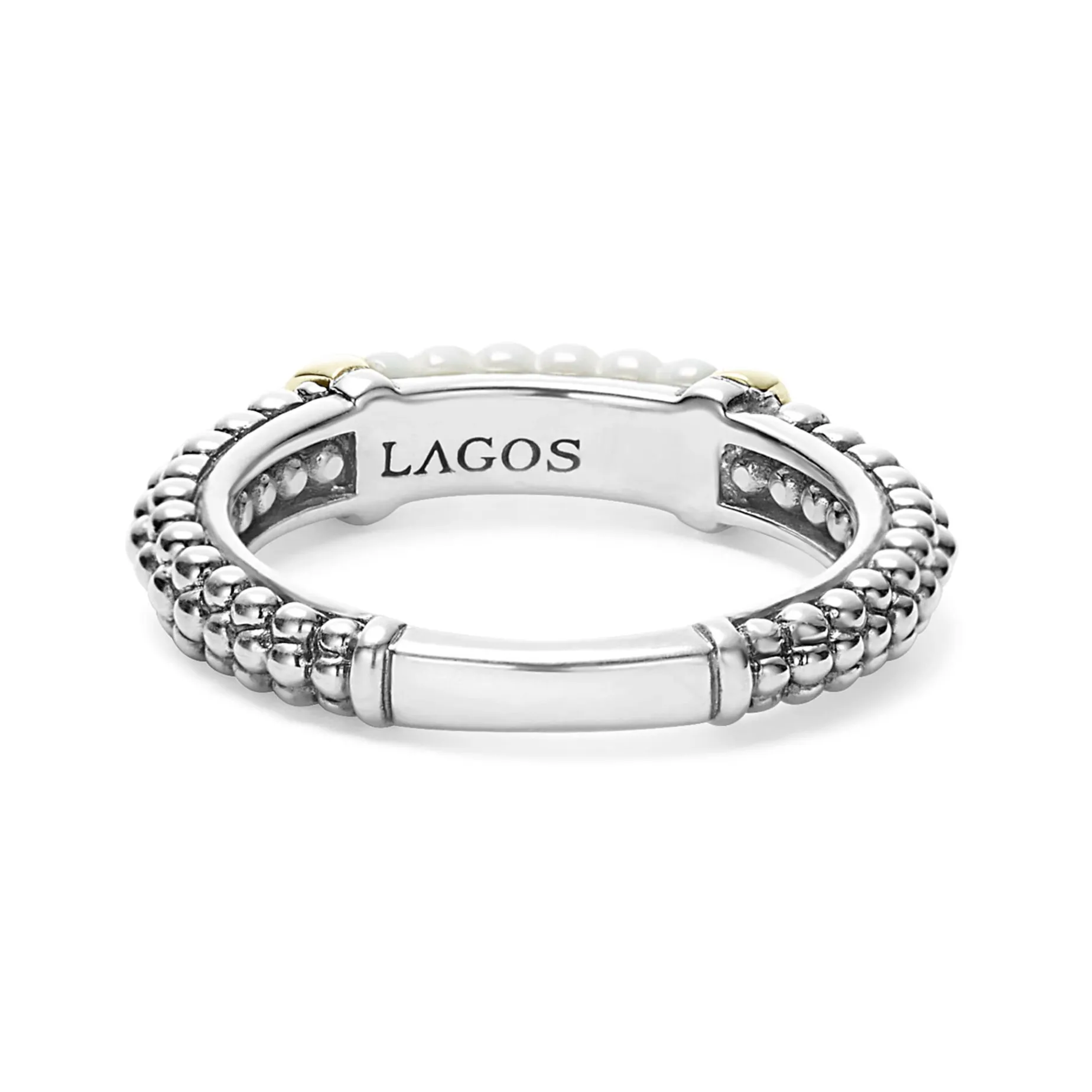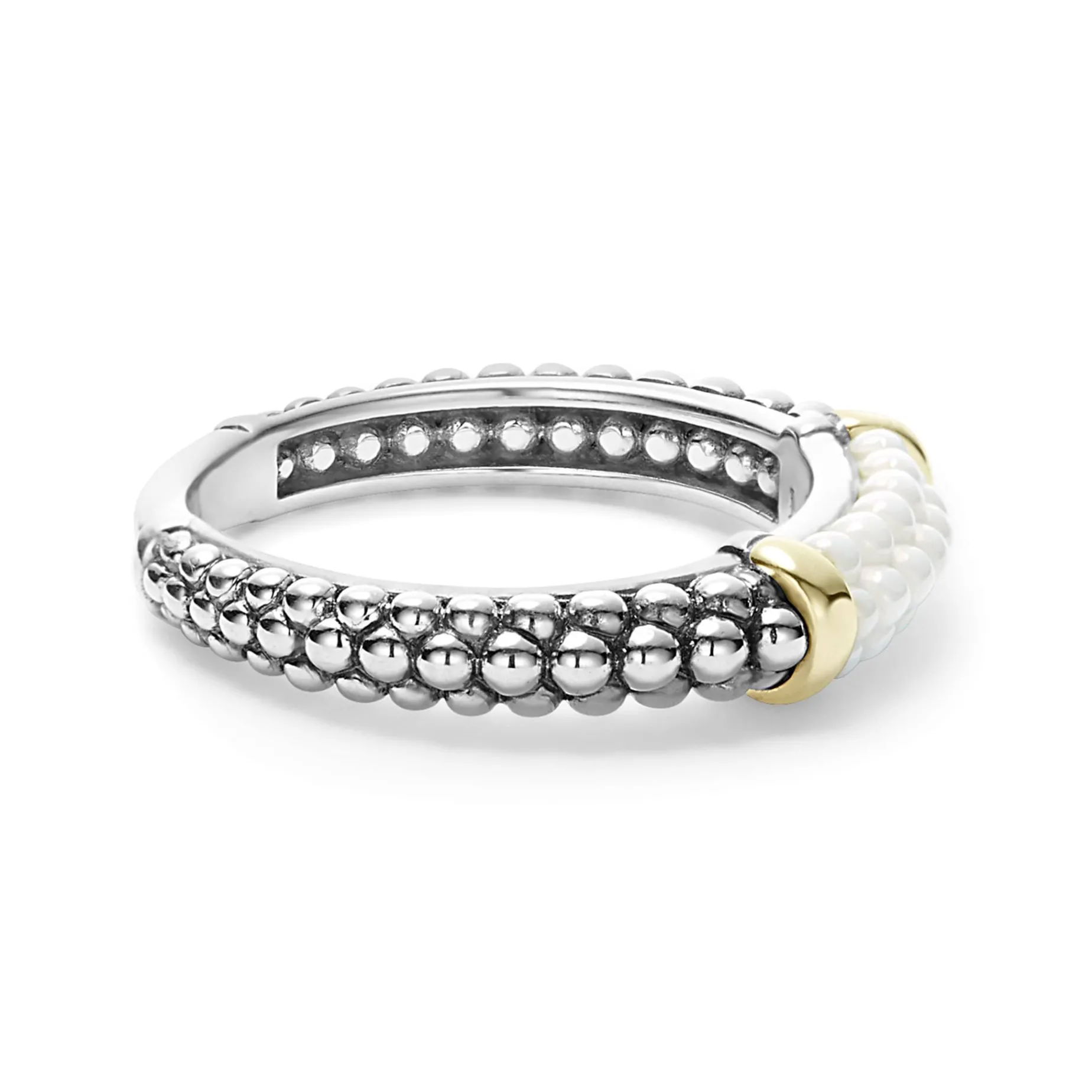 White Ceramic Stacking Ring With 18K Gold And Sterling Silver Caviar Beading.