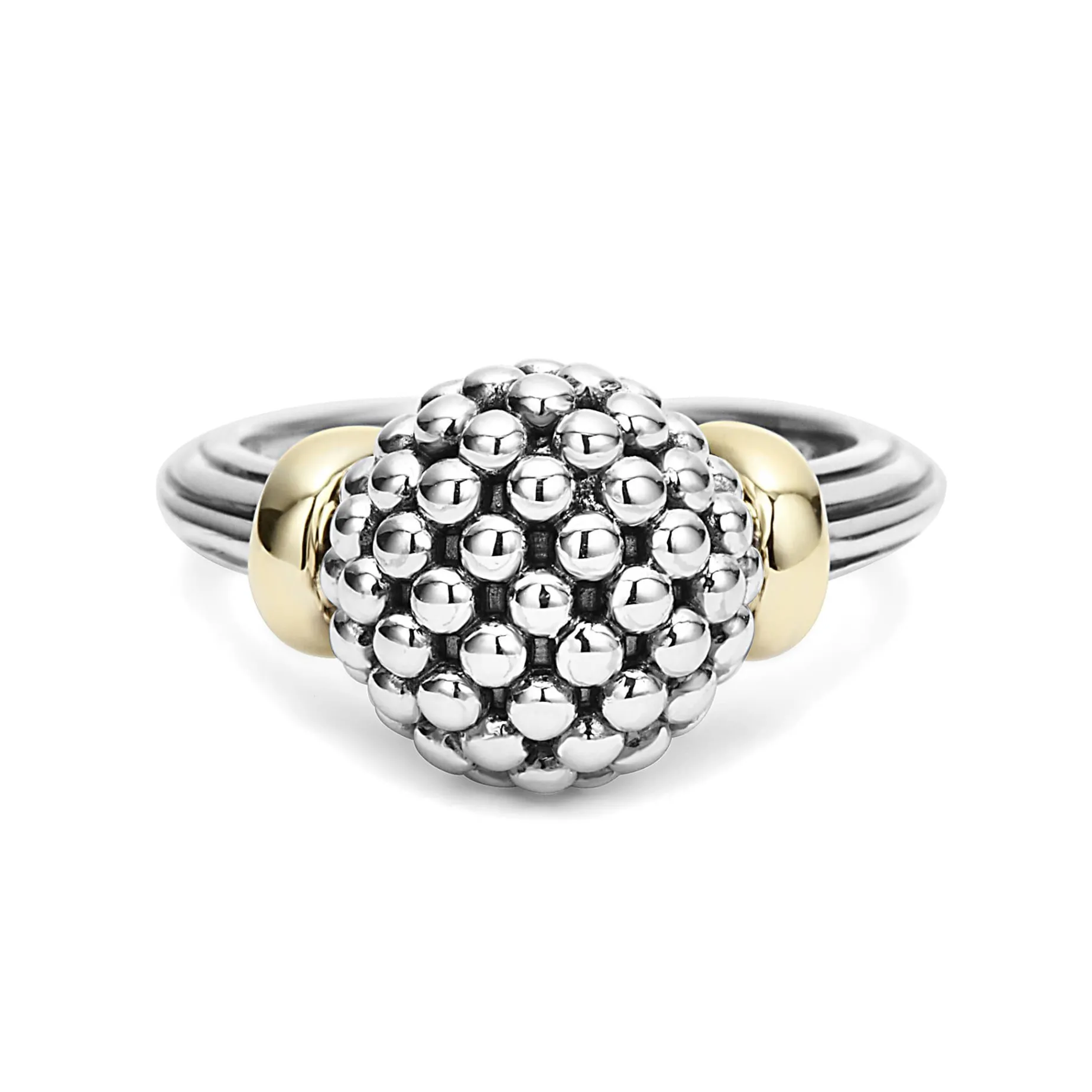 Sterling Silver Caviar Beaded Ring With A Fluted Band And 18K Gold Details.