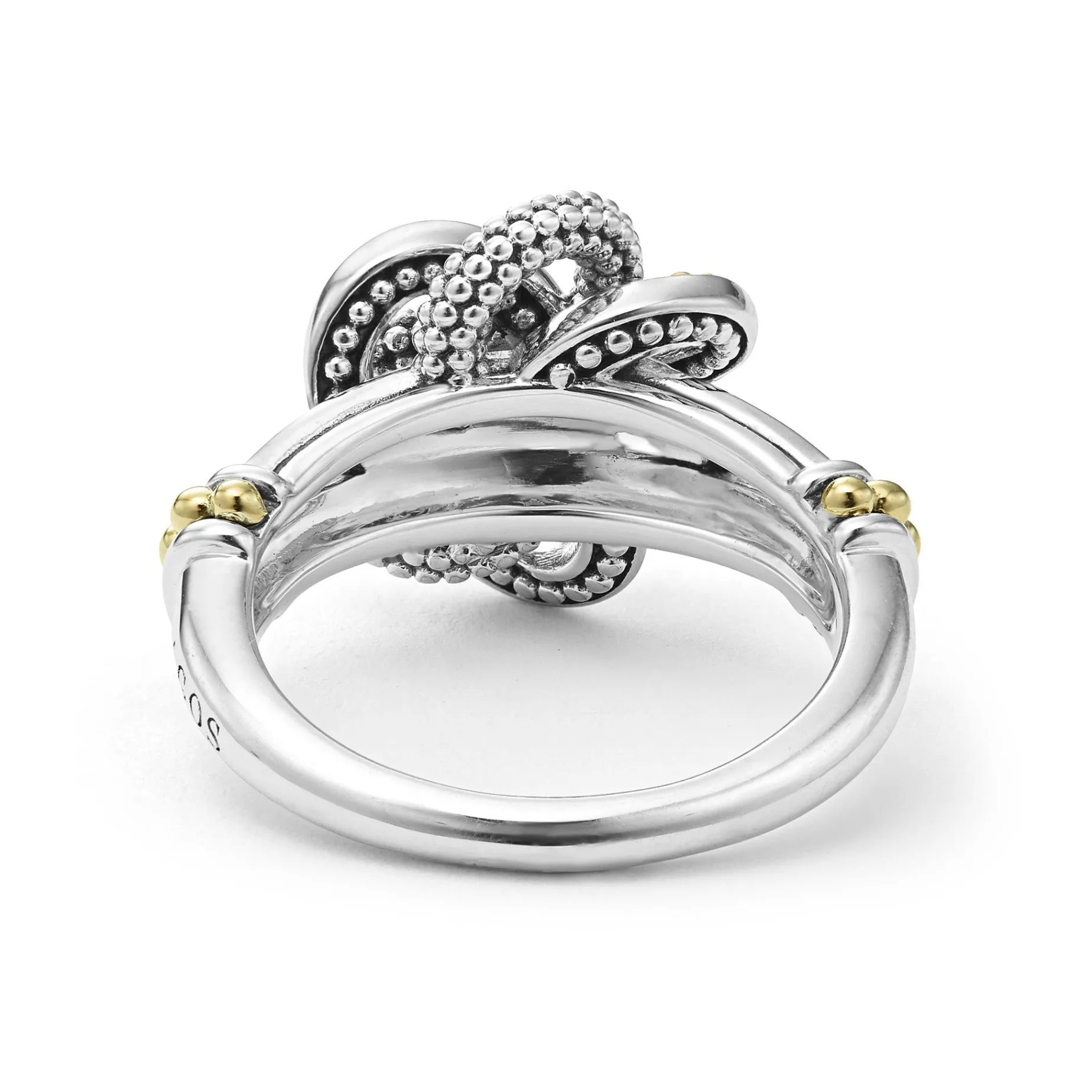 Bands Of 18K Gold And Sterling Silver Caviar Beading Form This Love Knot Ring.