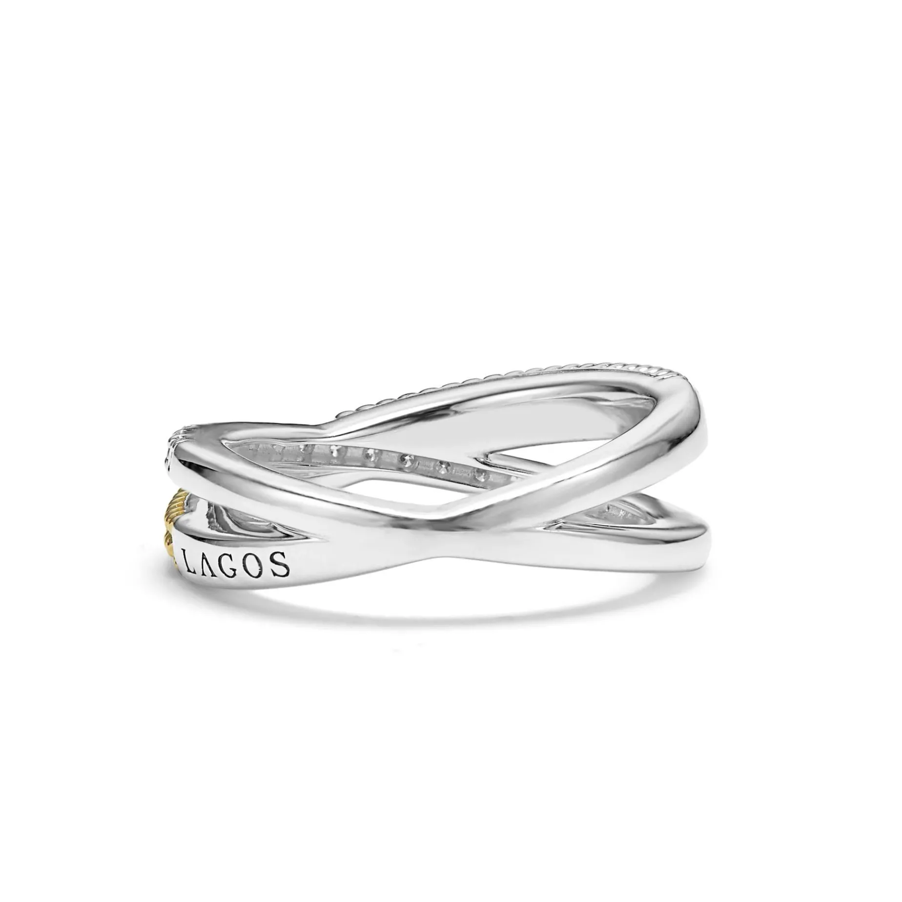 Diamonds And 18K Gold Caviar Beading On A Sterling Silver Band Form This X-Ring. Lagos Diamonds Are The Highest Quality Natural Stones.