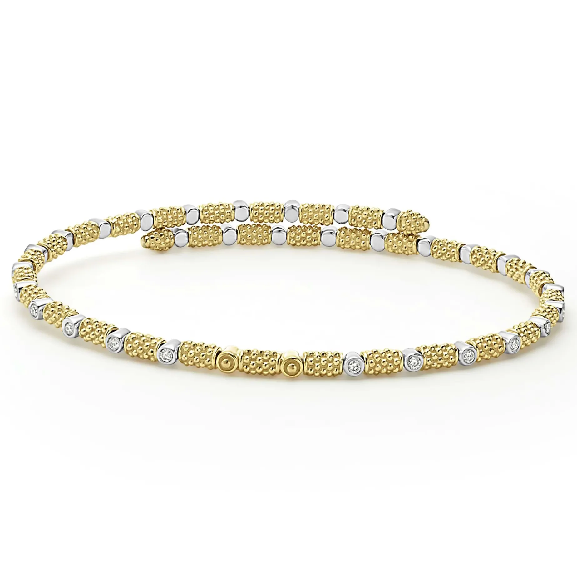 Diamonds Surrounded By 18K Gold Superfine Caviar Beading Form This Cuff Bracelet. Lagos Diamonds Are The Highest Quality Natural Stones.
