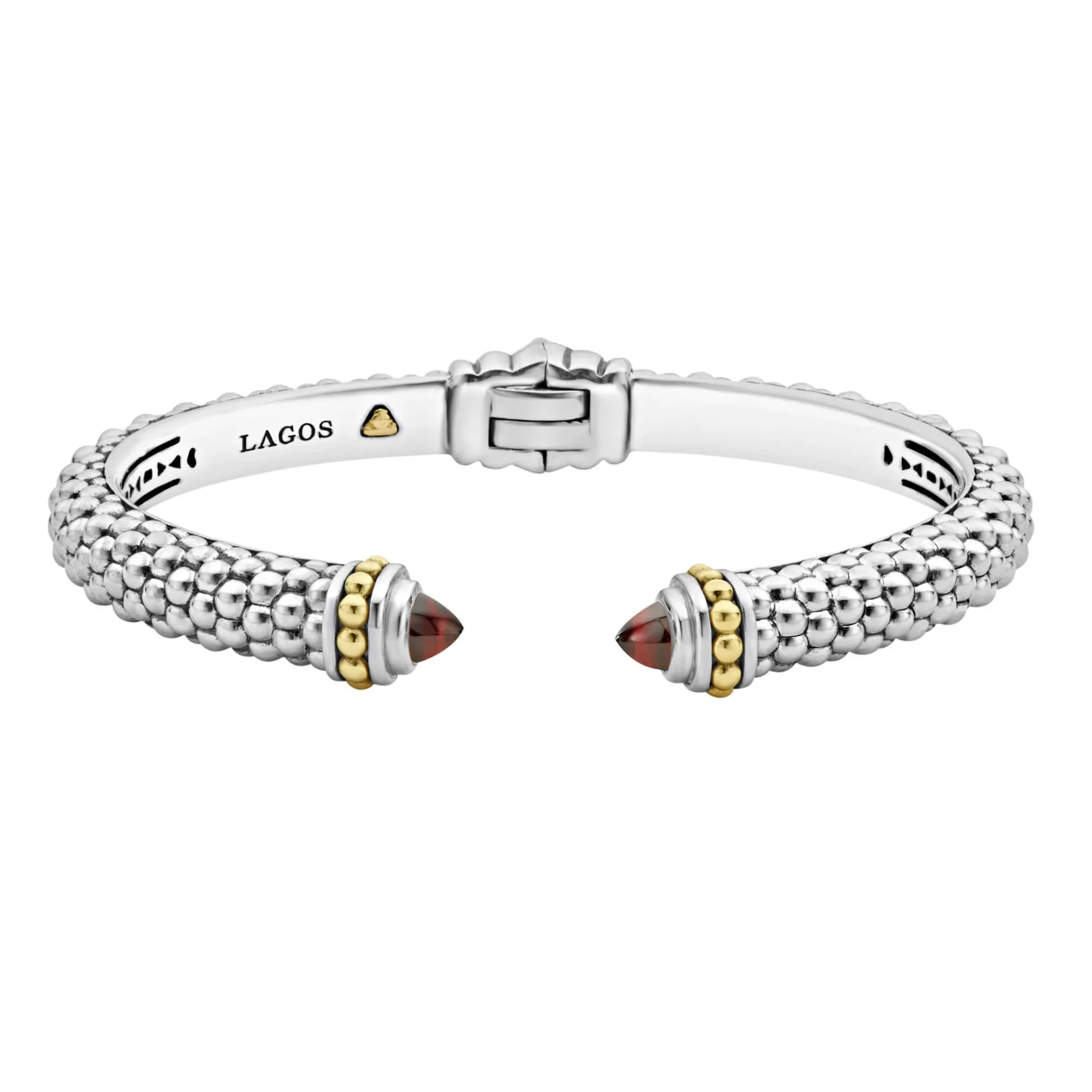 Caviar Beading And Highly Polished Sterling Silver Stations Comprise This Innovative Cuff Bracelet Detailing Garnet Gemstone End Caps.