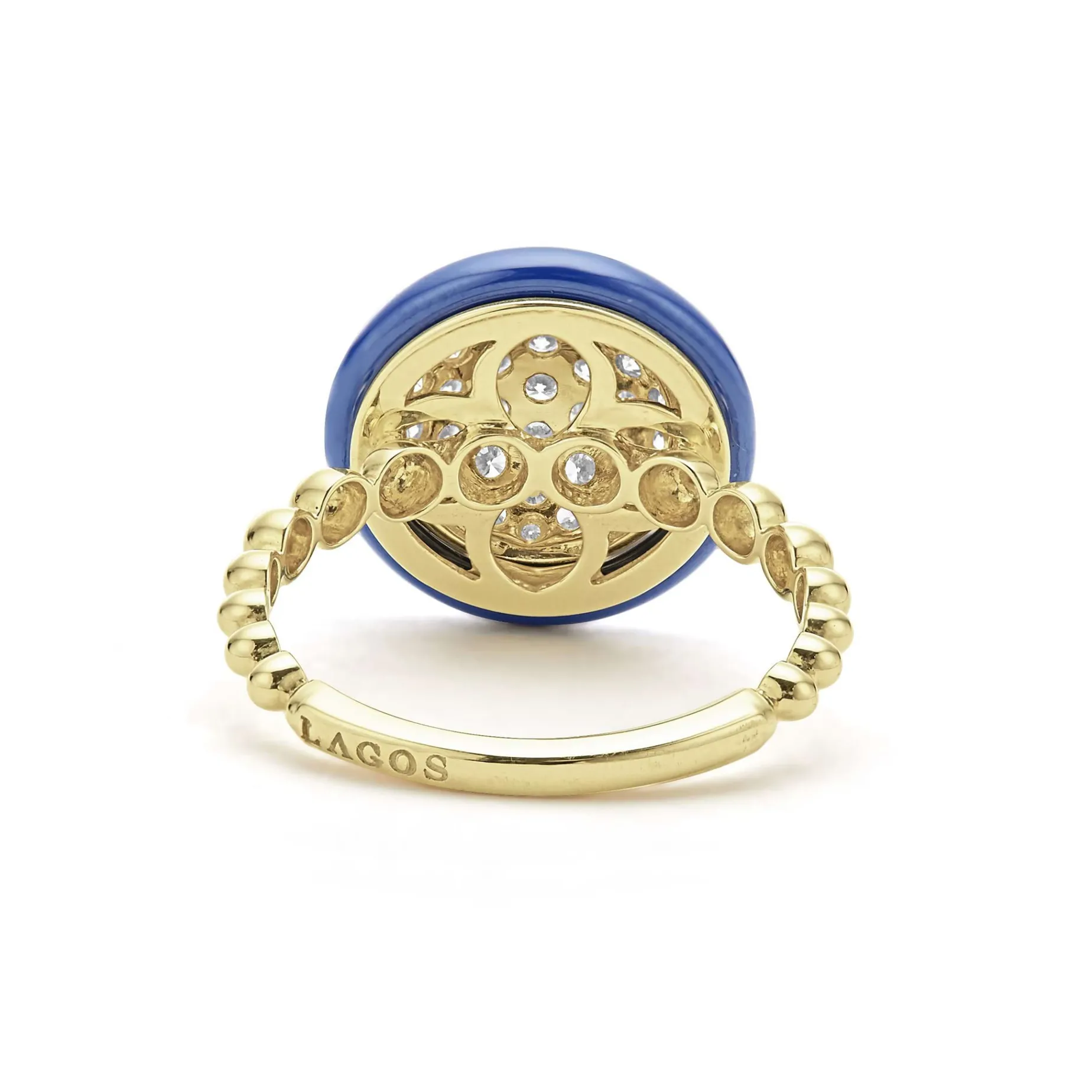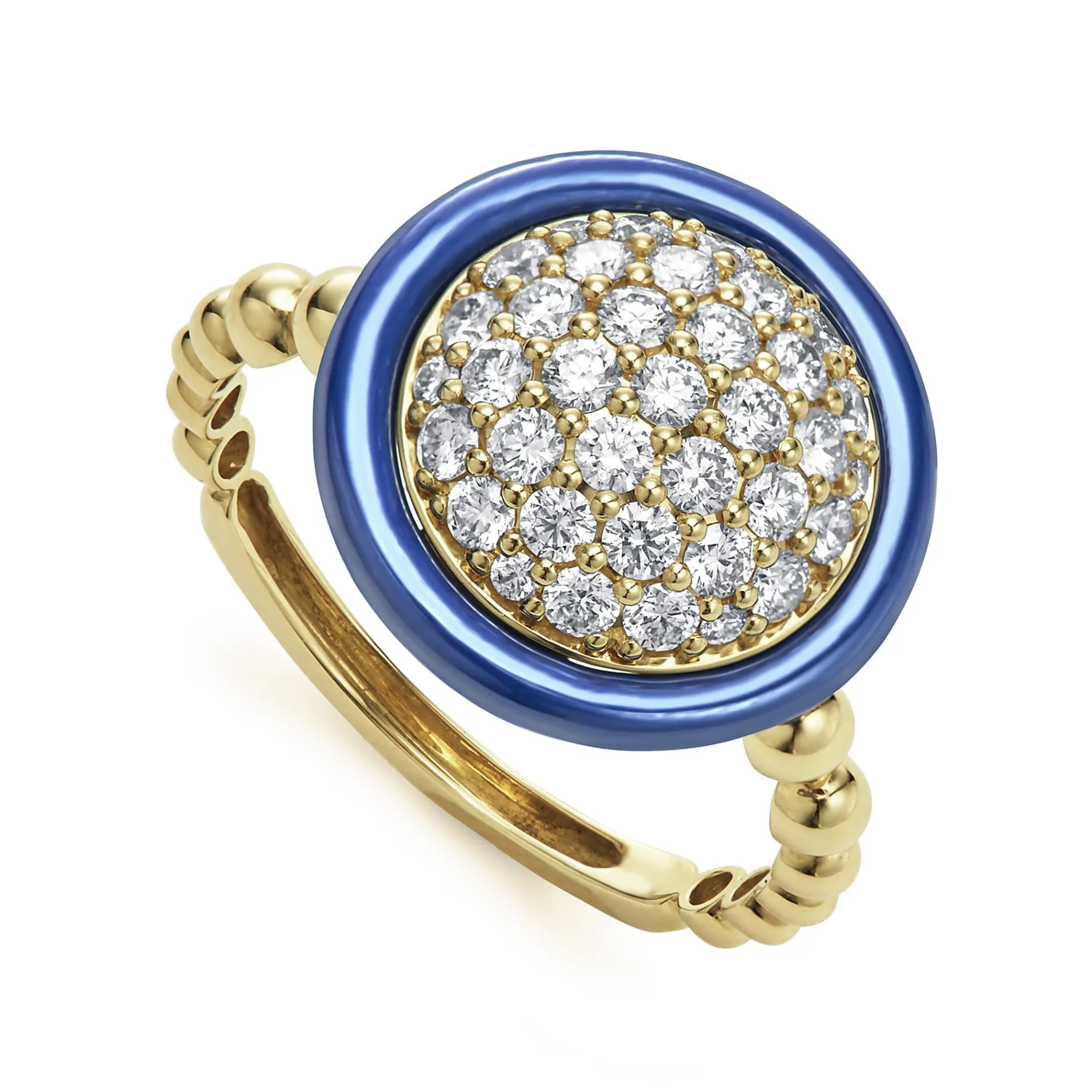 Round Diamond 18K Gold Statement Ring Framed By Ultramarine Ceramic. Lagos Diamonds Are The Highest Quality Natural Stones.