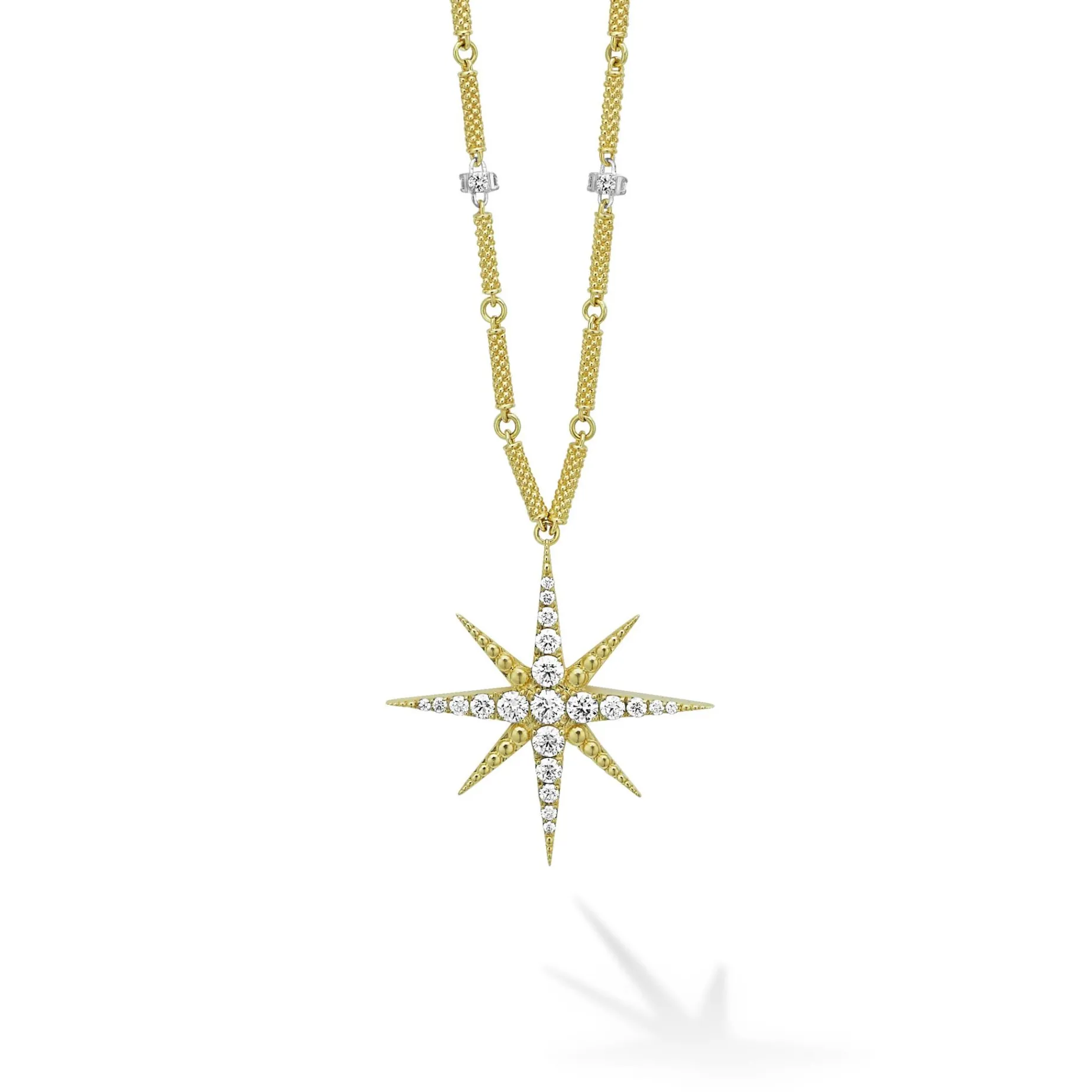 Diamonds And 18K Gold Superfine Caviar Beading In A Star Motif Form This Pendant Necklace. Lagos Diamonds Are The Highest Quality Natural Stones.