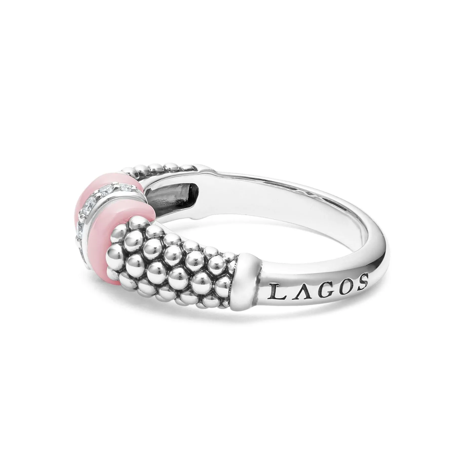 Diamonds Set In Sterling Silver Are Accented By A Pop Of Pink Ceramic And Caviar Beading On This Every Day Ring. Lagos Diamonds Are The Highest Quality Natural Stones.