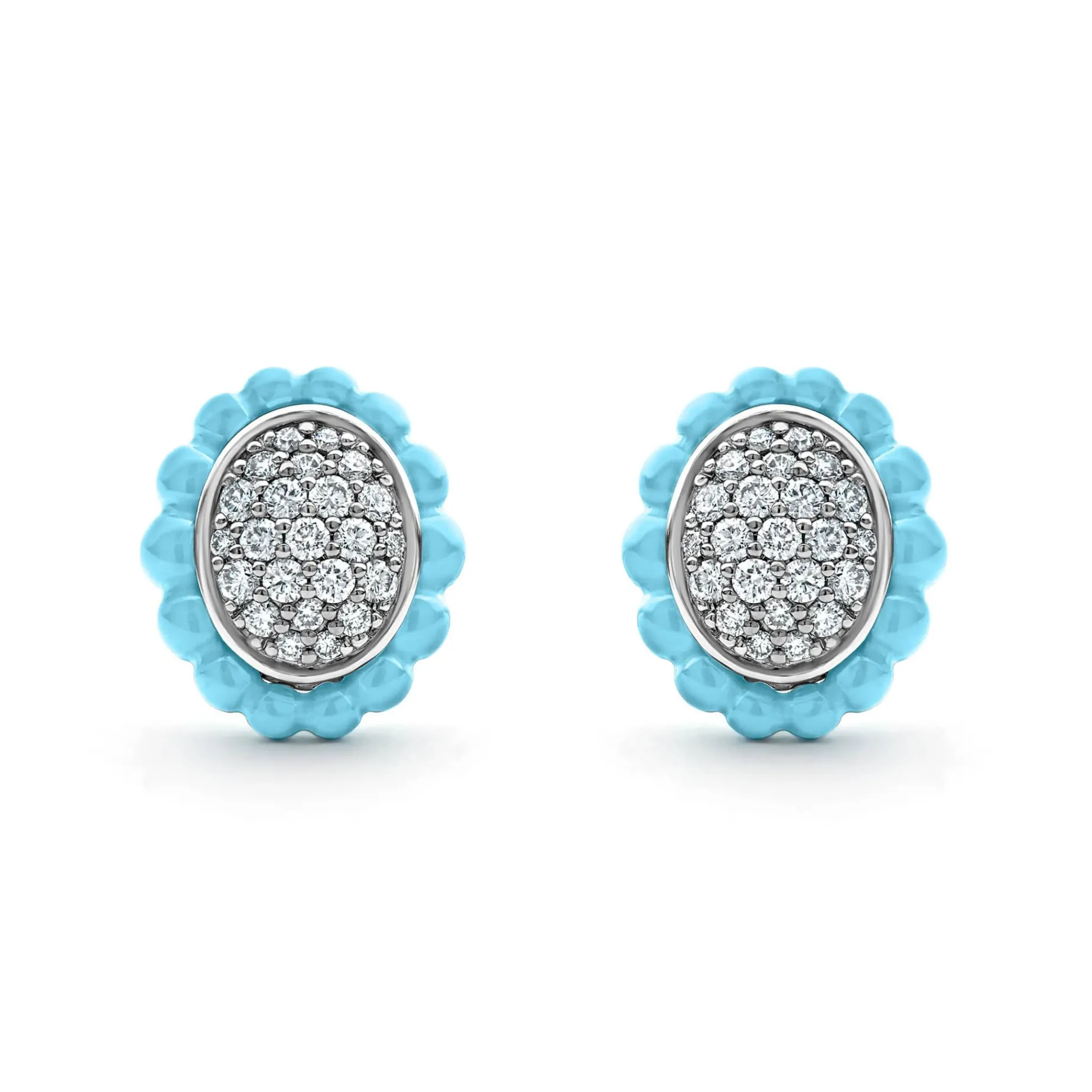 Blue Ceramic Beading Surrounds These Diamond Stud Earrings. Lagos Diamonds Are The Highest Quality Natural Stones.