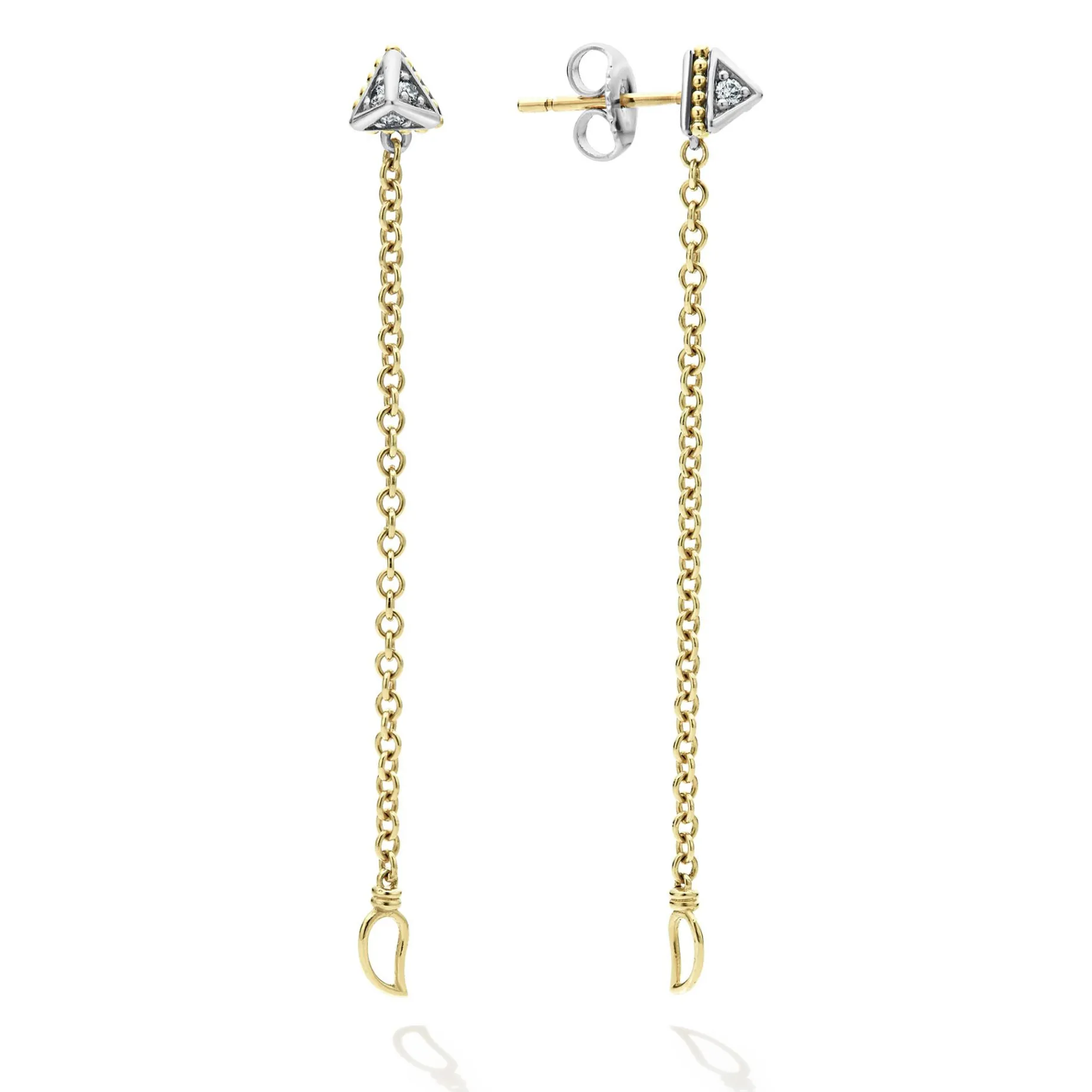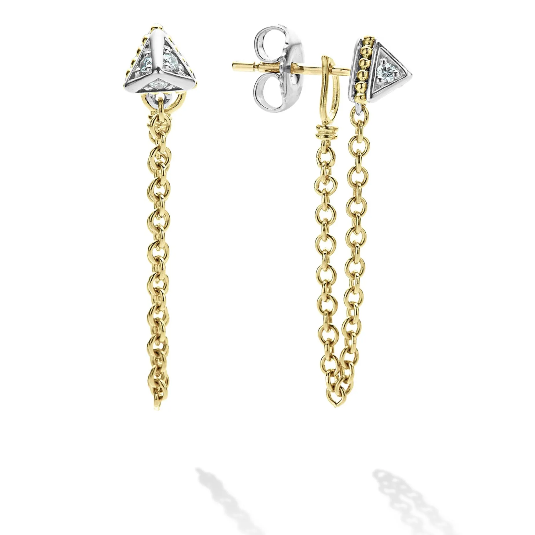The Convertible Chain Earrings Featuring A Diamond Pyramid With An 18K Gold Chain That Offers Three Different Ways To Wear: Drop, Hook Chain On Same Ear Piercing, And Hook Chain On Different Ear Piercing.