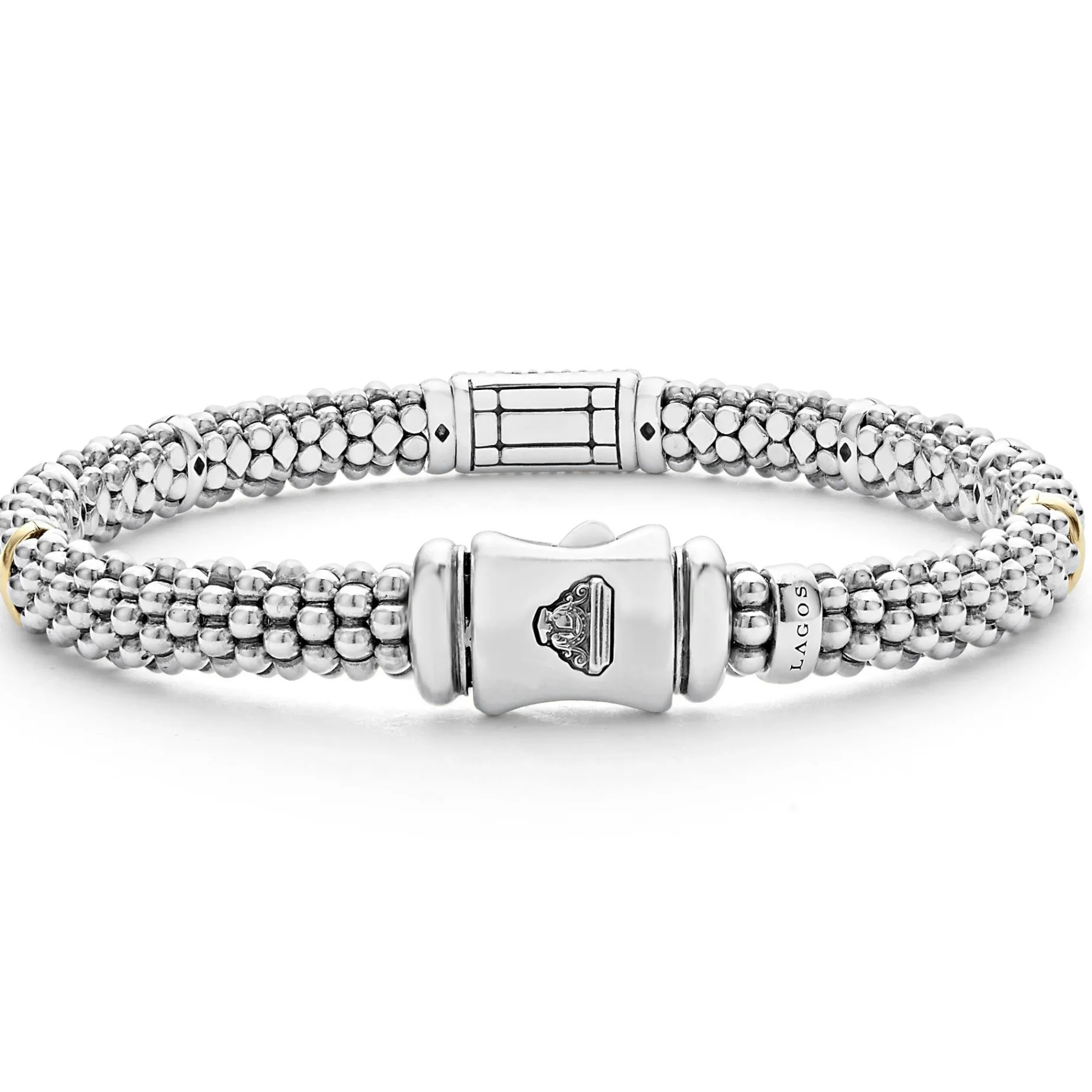 Ten 18K Gold Stations On This Sterling Silver Caviar Beaded Bracelet With Pavé Diamonds Set In 18K Gold. Lagos Diamonds Are The Highest Quality Natural Stones.