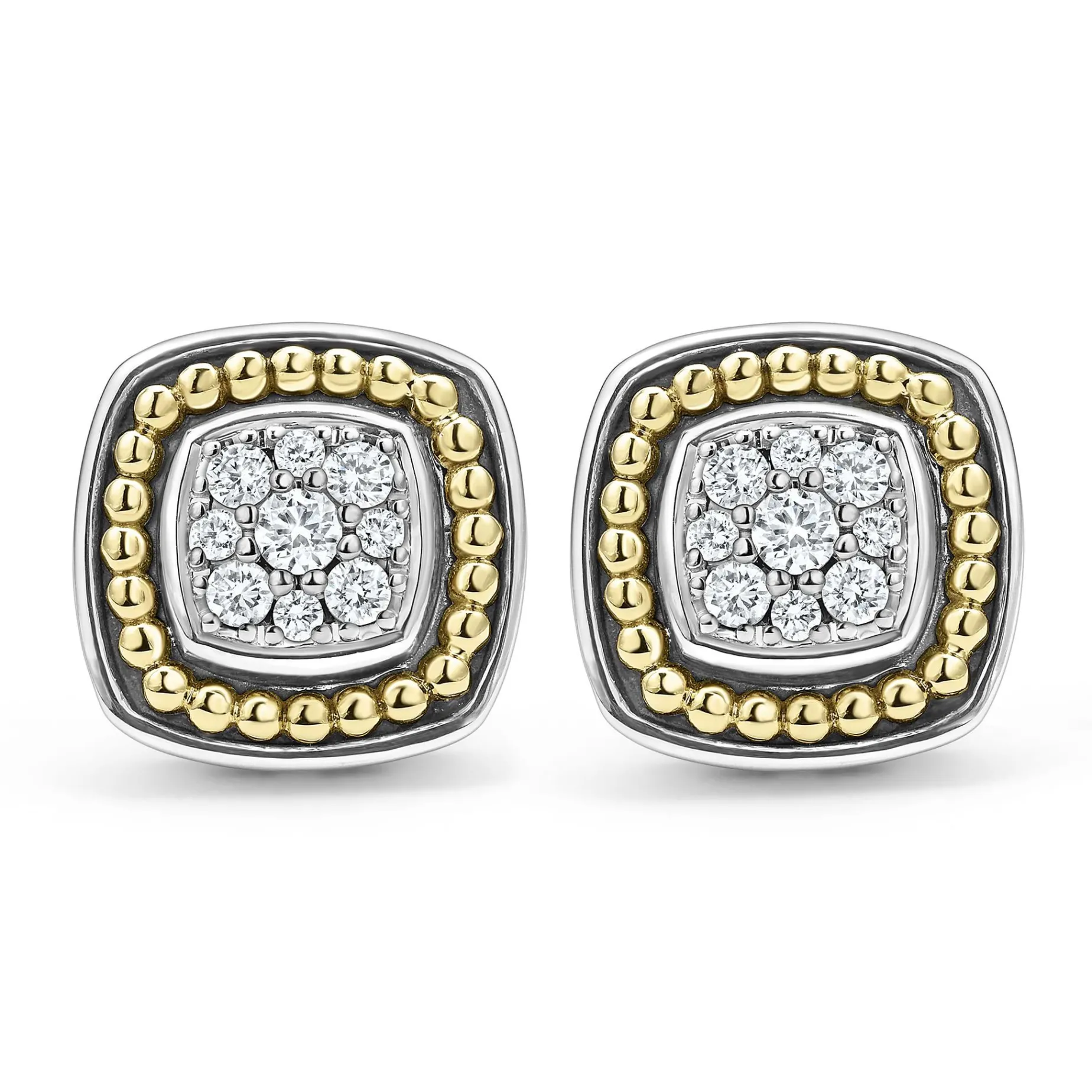 A Lagos Exclusive. Diamonds Surrounded By Sterling Silver And 18K Gold Caviar Beading Form These Stud Earrings. Lagos Diamonds Are The Highest Quality Natural Stones.