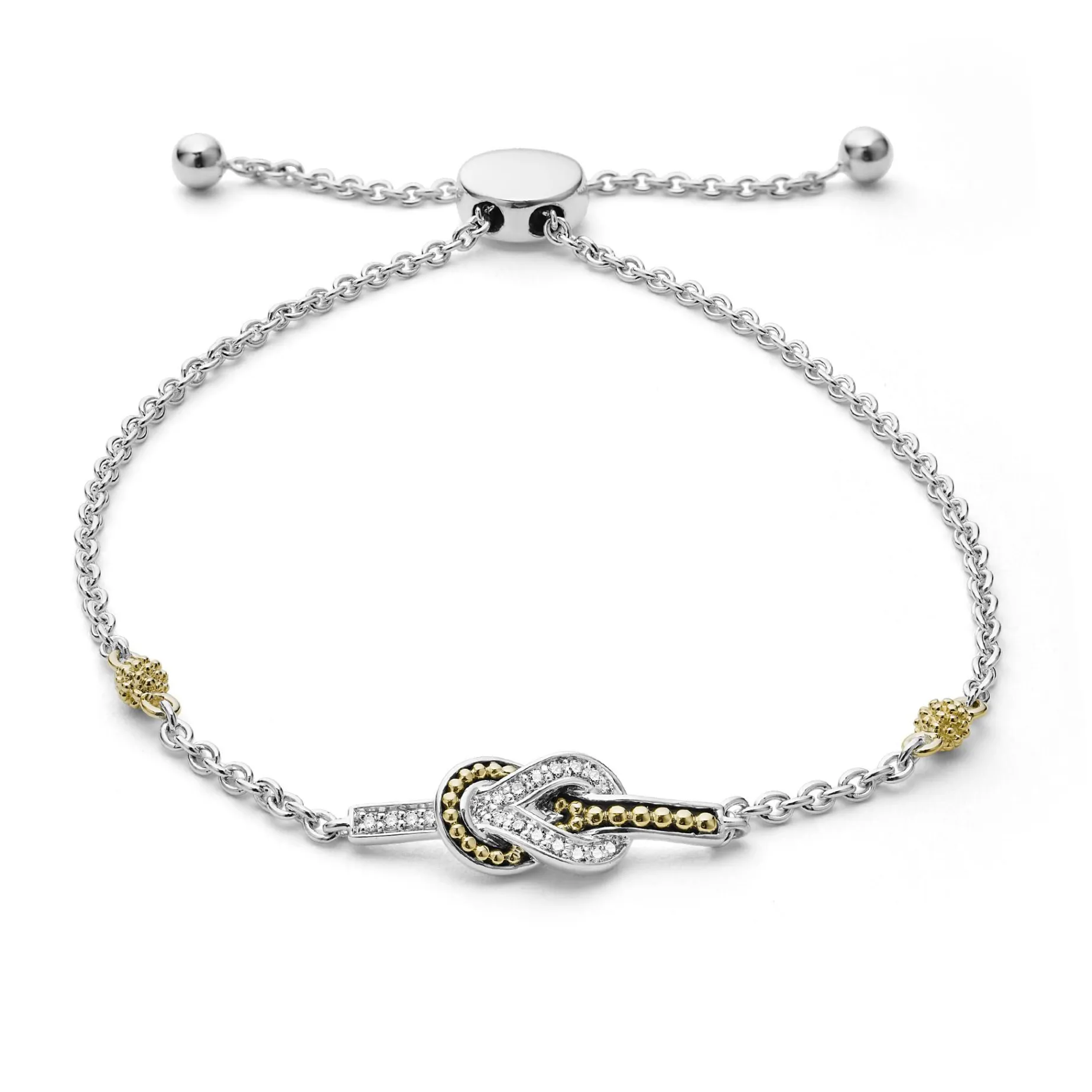 Diamonds And 18K Gold Woven In A Knot Motif Form This Newport Adjustable Bolo Bracelet. Lagos Diamonds Are The Highest Quality Natural Stones.