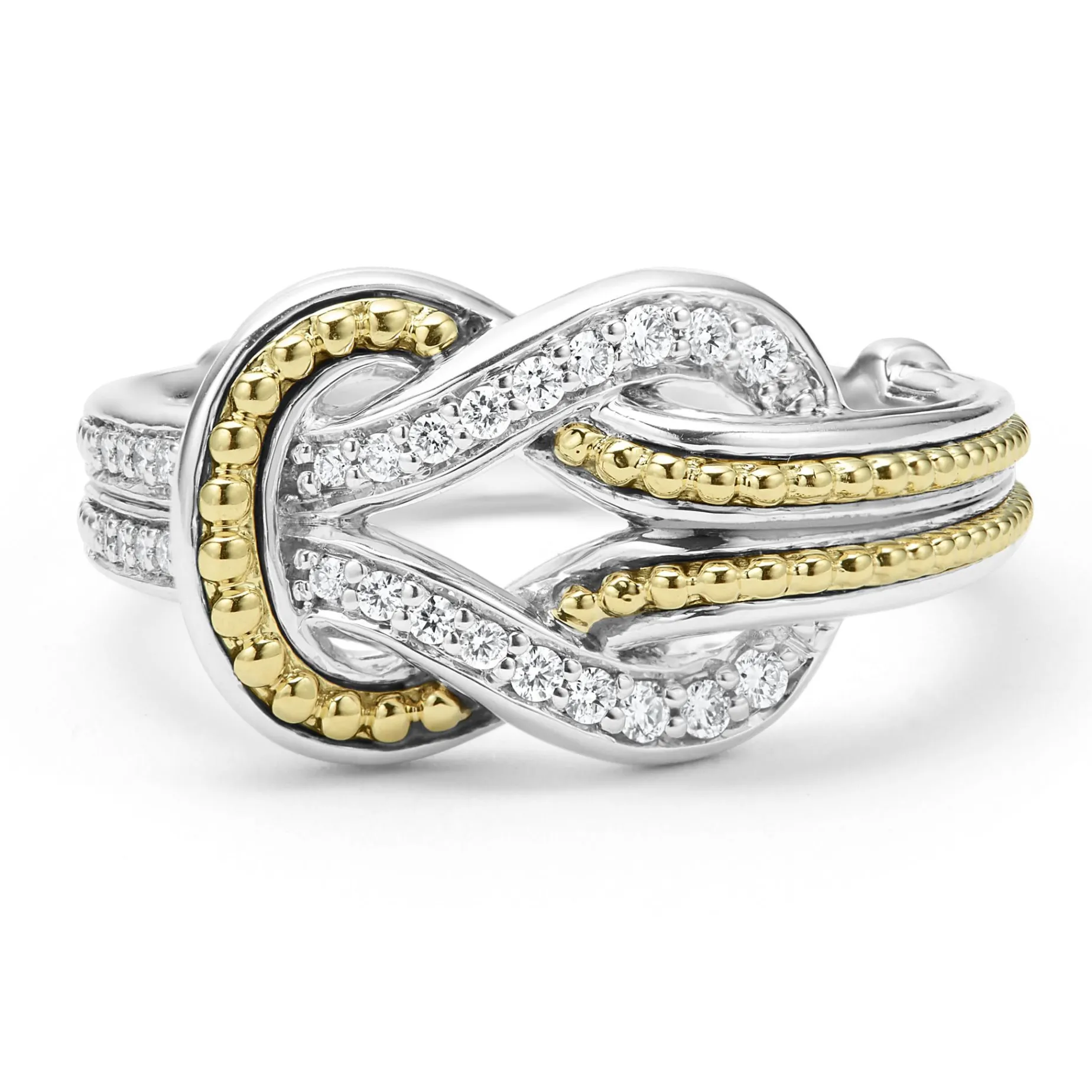 Diamonds And 18K Gold Woven In A Knot Motif Form This Ring. Lagos Diamonds Are The Highest Quality Natural Stones.