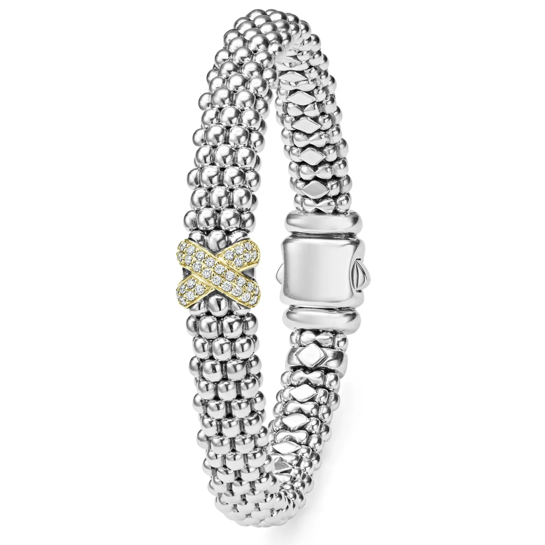 A Single Diamond X Station Set In 18K Gold Wraps This Signature Sterling Silver Caviar Beaded Bracelet. Lagos Diamonds Are The Highest Quality Natural Stones.