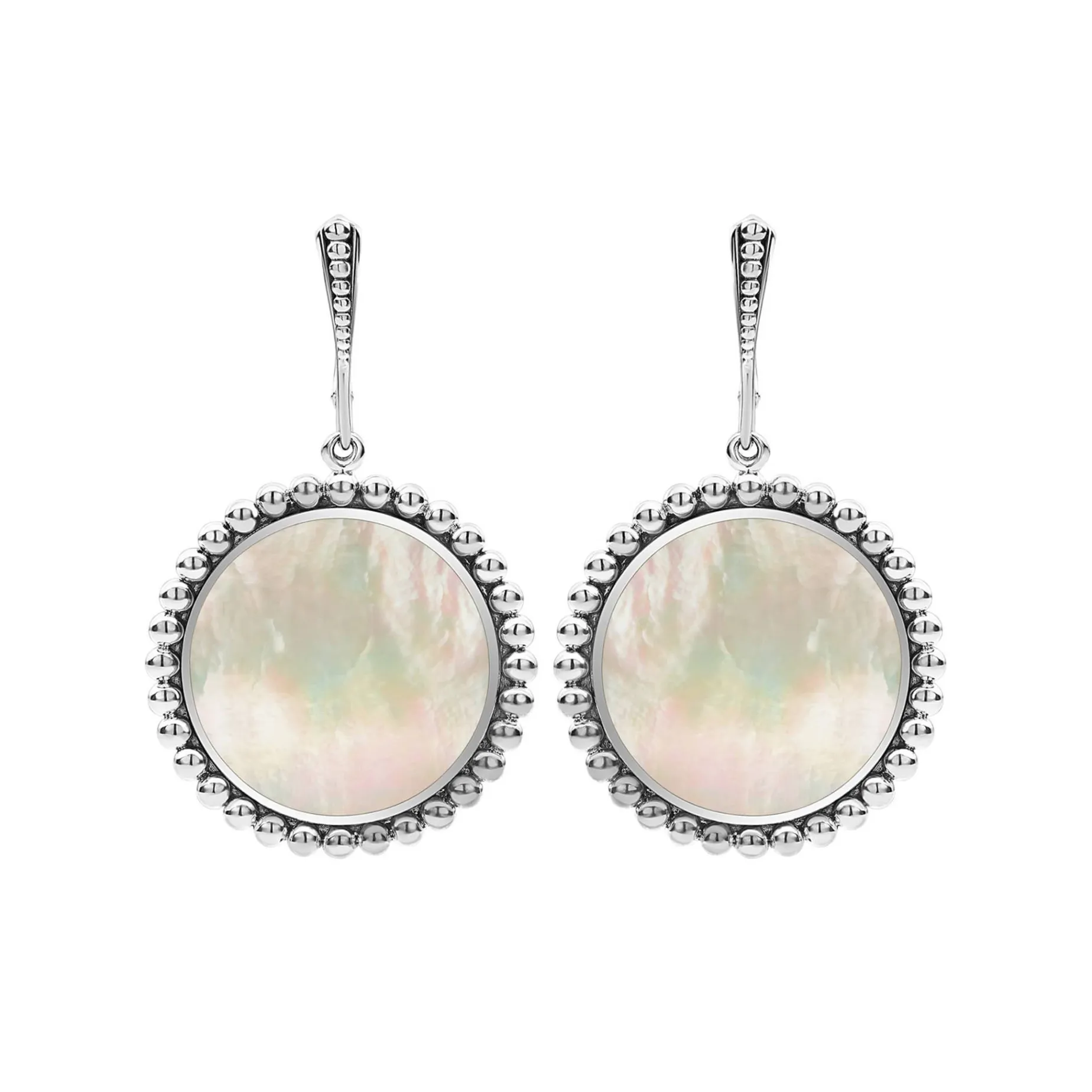 Mother Of Pearl Gemstone Circle Drop Earrings Surrounded By Sterling Silver Caviar Beading.