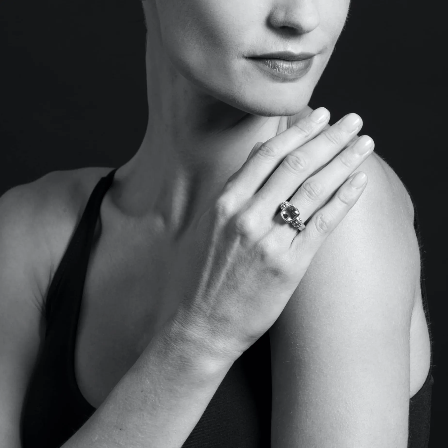 Prasiolite Bezel-Set Gemstone Ring With 18K Caviar Beading On A Sterling Silver Band.