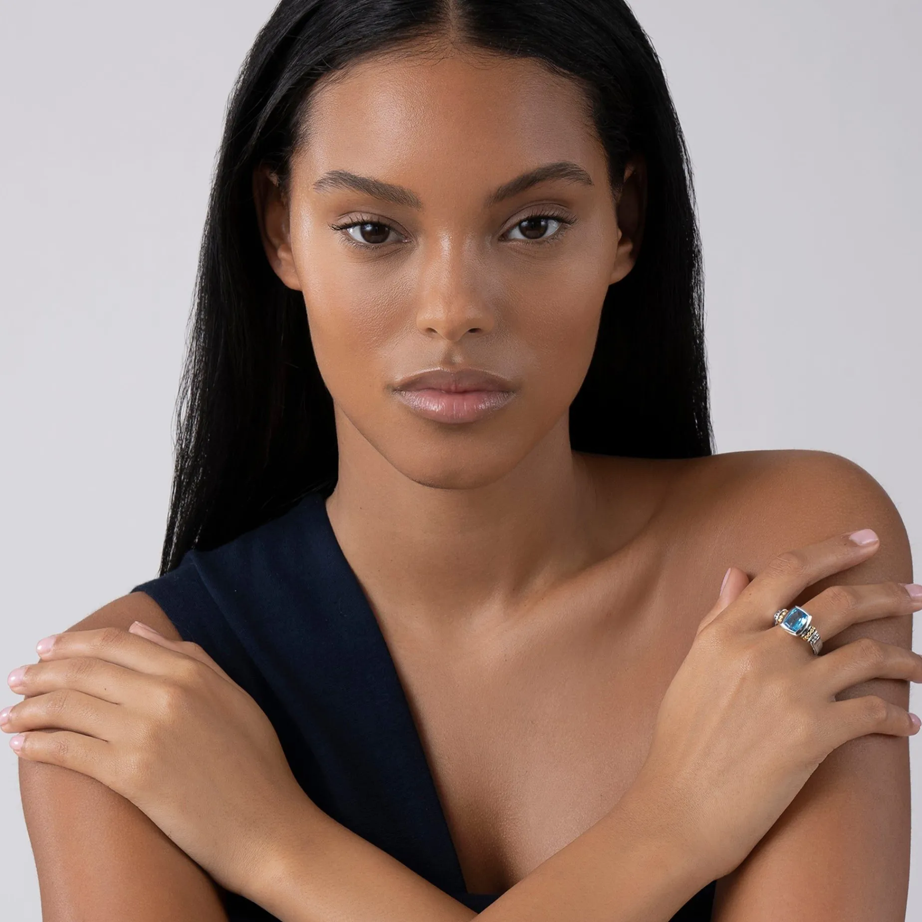 Swiss Blue Topaz Bezel-Set Gemstone Ring With 18K Caviar Beading On A Sterling Silver Band.