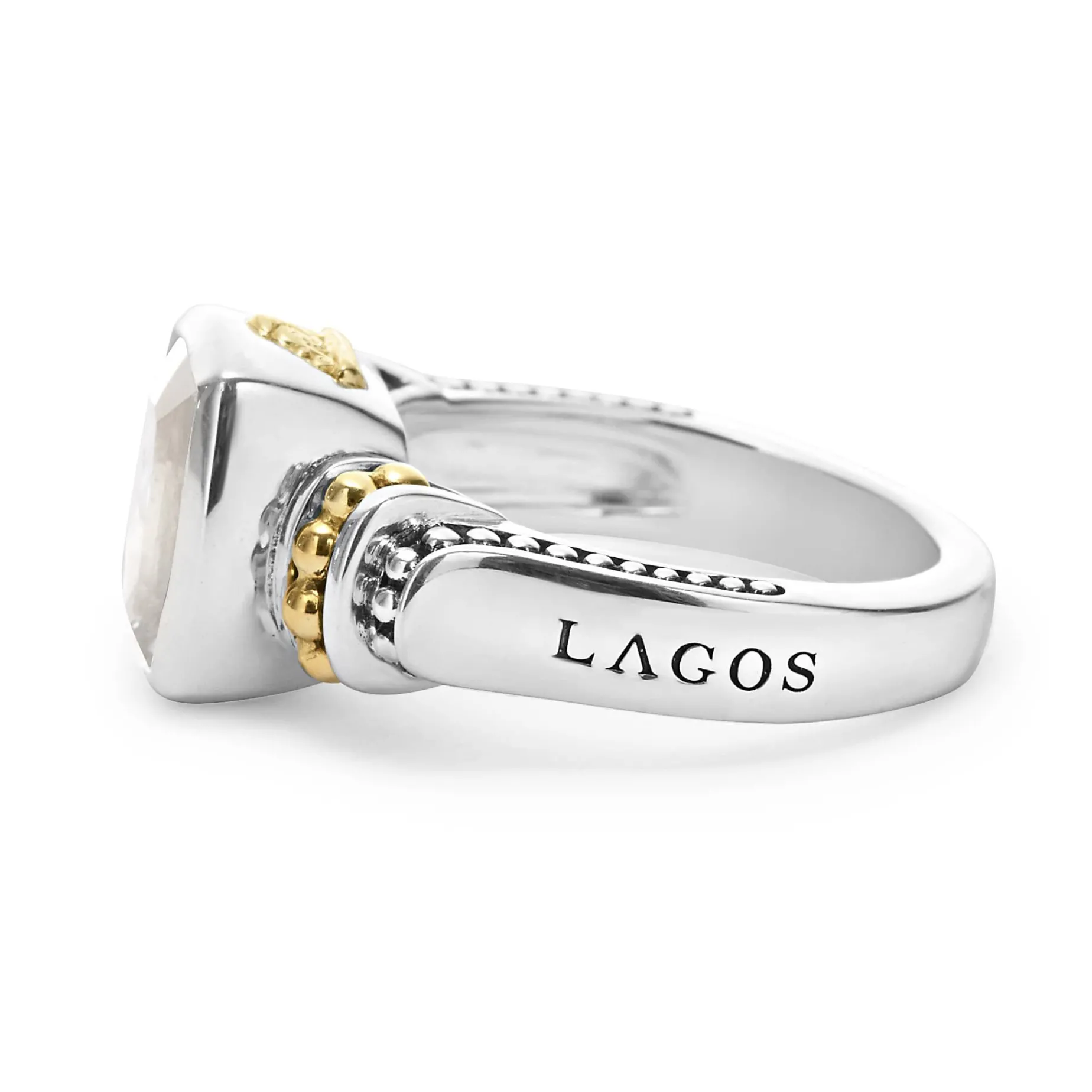 White Topaz Bezel-Set Gemstone Ring With 18K Caviar Beading On A Sterling Silver Band.