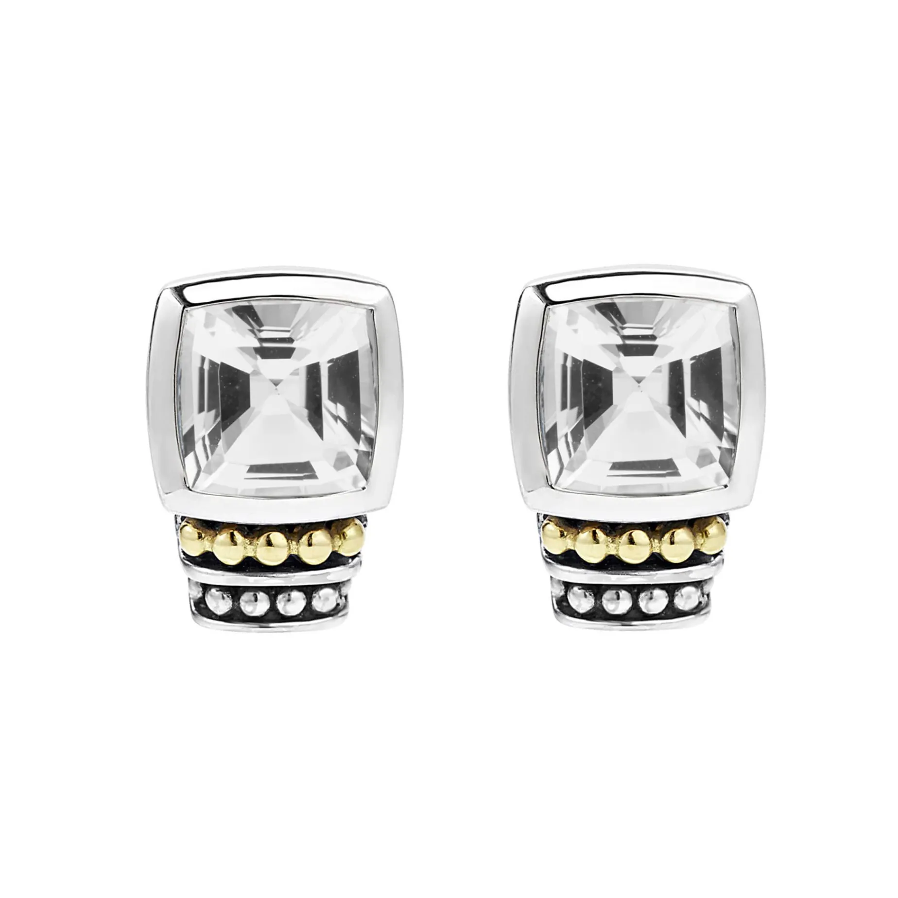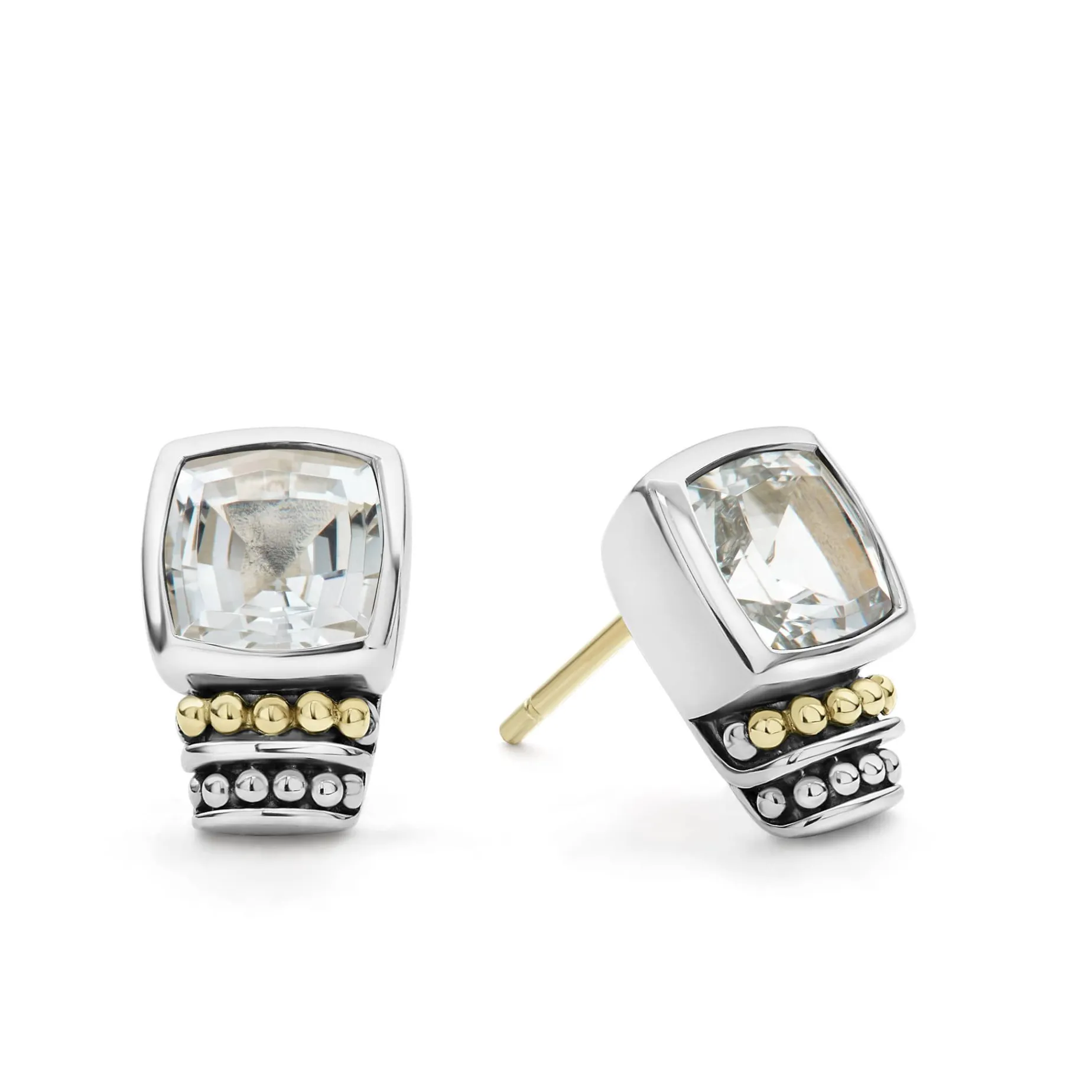 White Topaz Bezel-Set Gemstone Stud Earrings With 18K Gold And Sterling Silver Caviar Beaded Accents.