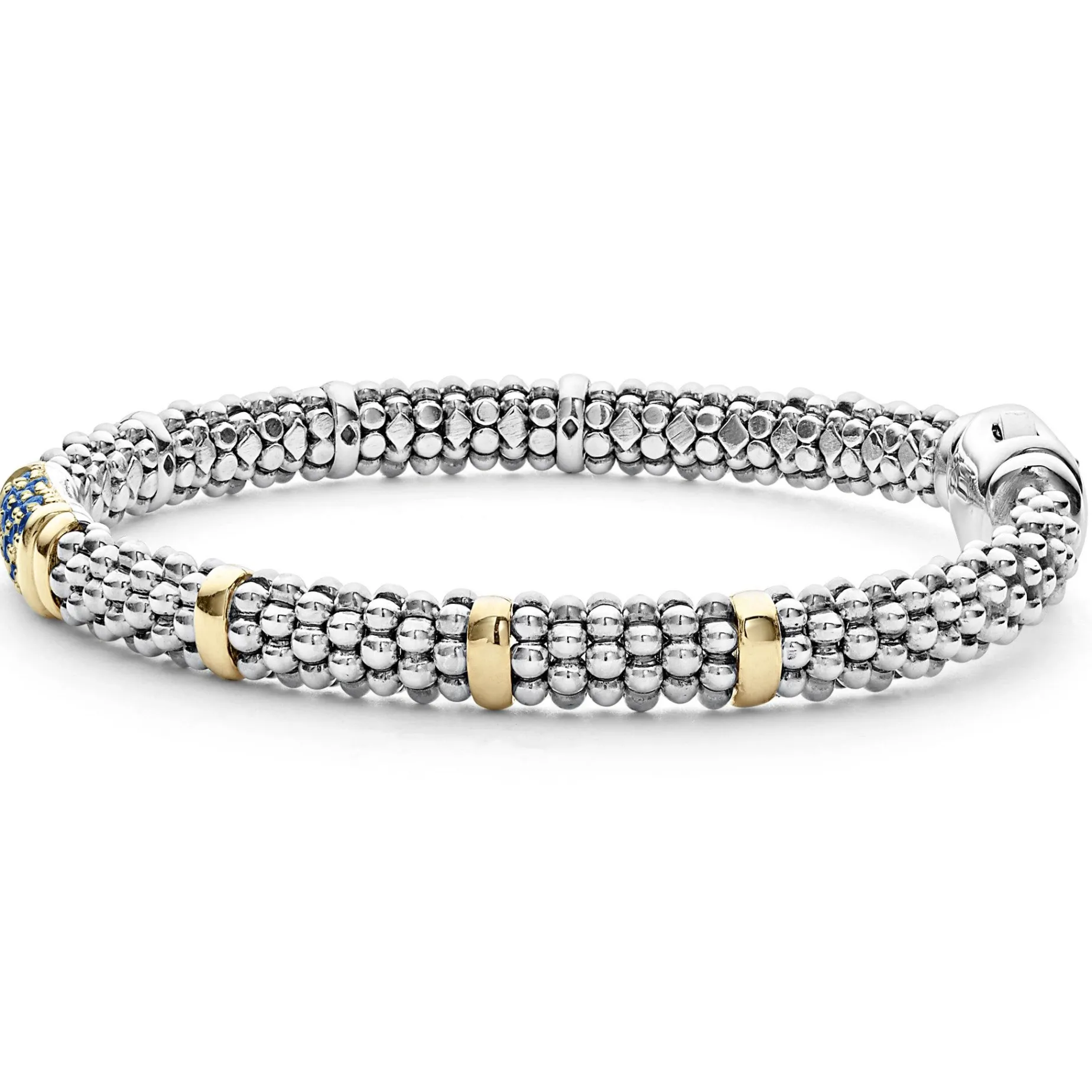 Ten 18K Gold Stations Highlight This Sterling Silver Caviar Beaded Bracelet With A Pavé Station Of Blue Sapphire Precious Gemstones.