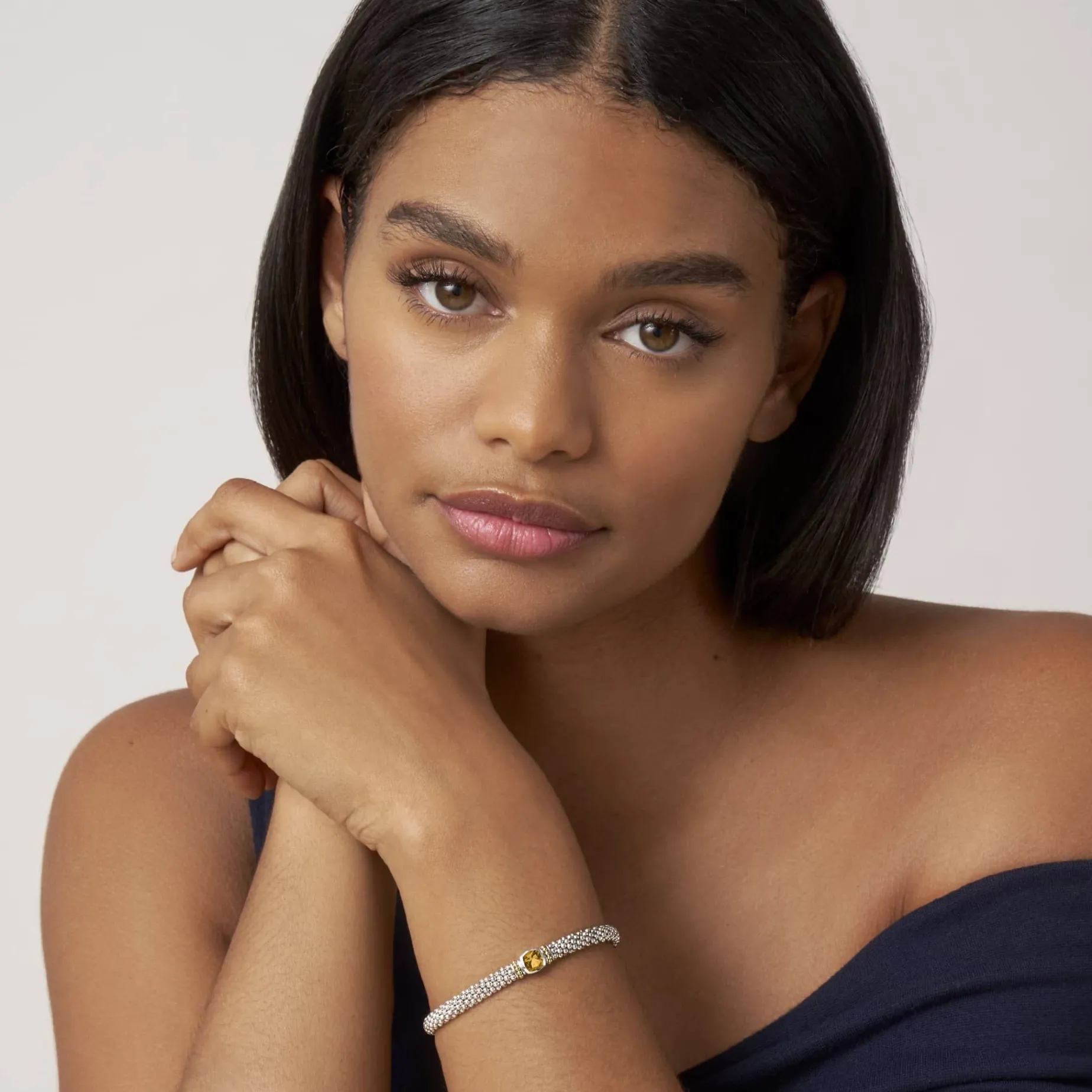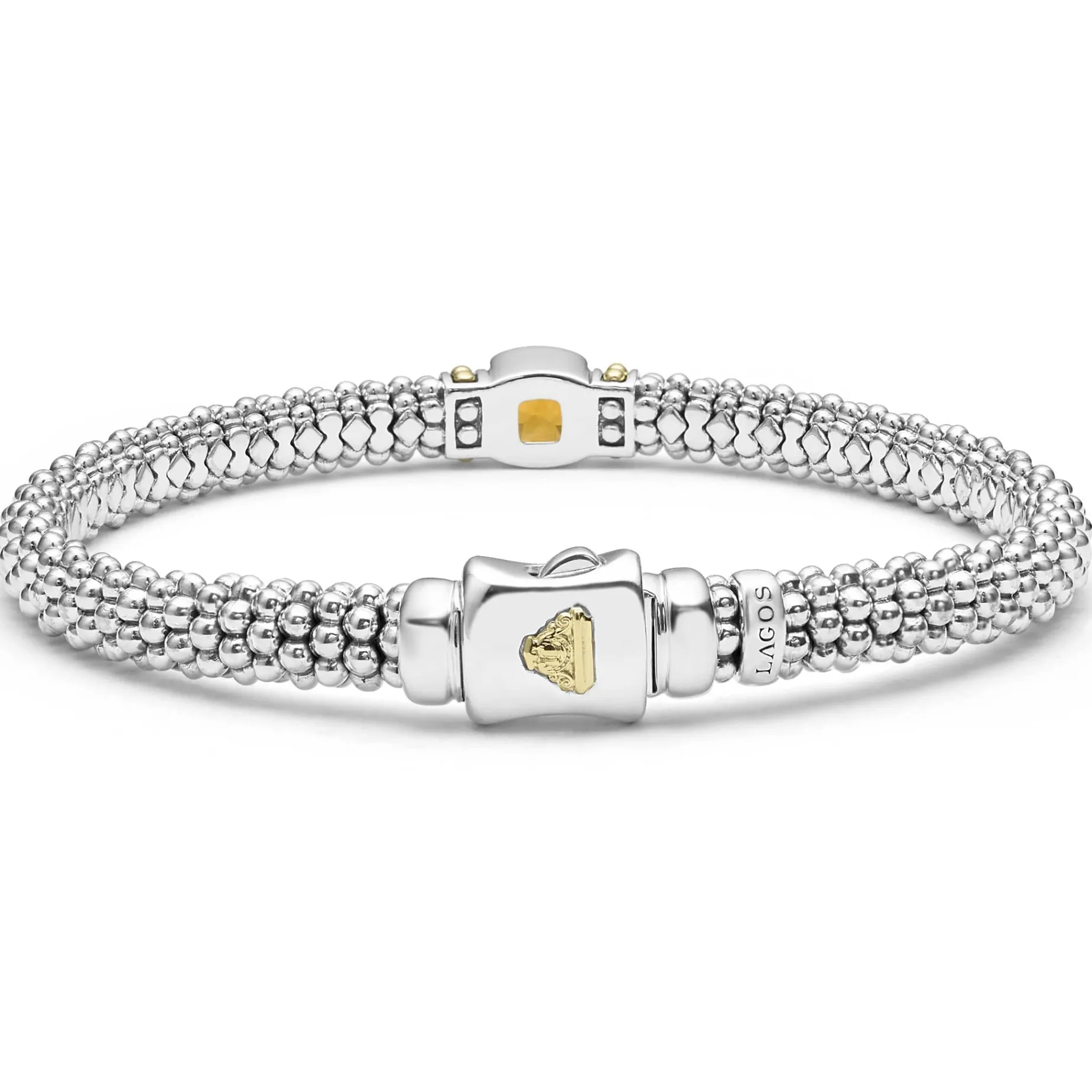 A Citrine Gemstone And Sterling Silver Caviar Beading With 18K Gold Detailing Forms This Bracelet.