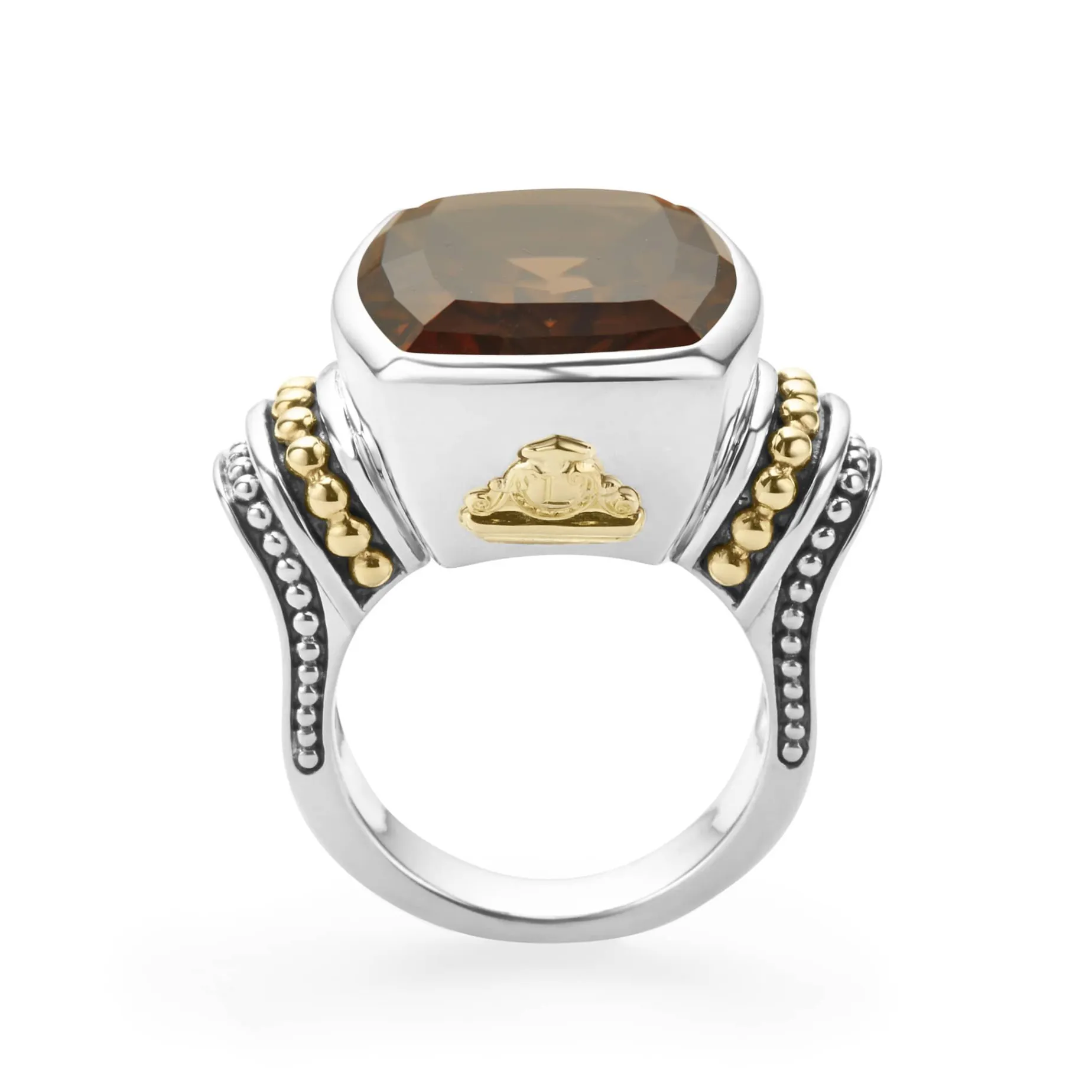 Smokey Quartz Bezel-Set Gemstone Statement Ring With 18K Caviar Beading On A Sterling Silver Band.