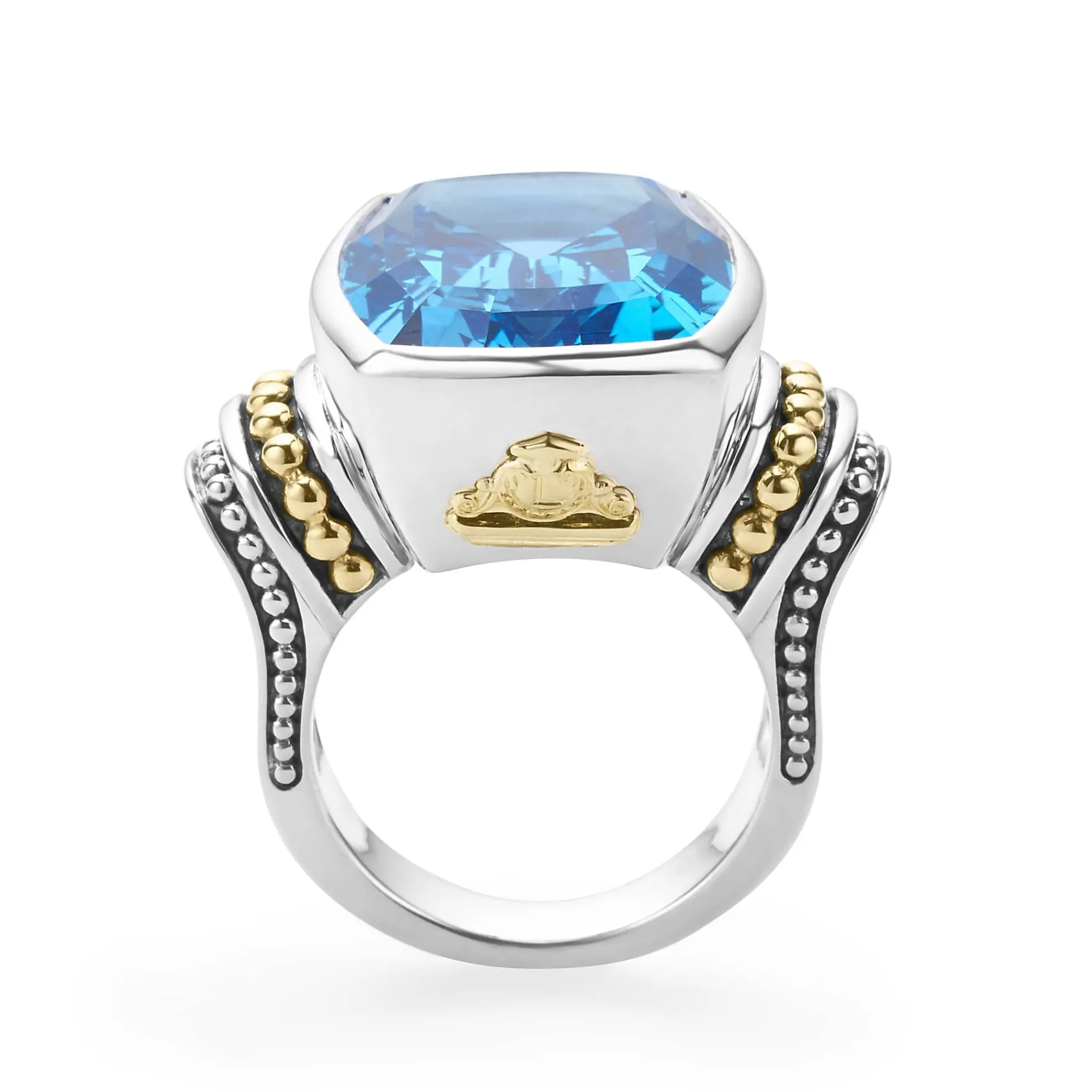 Swiss Blue Topaz Bezel-Set Gemstone Statement Ring With 18K Caviar Beading On A Sterling Silver Band.