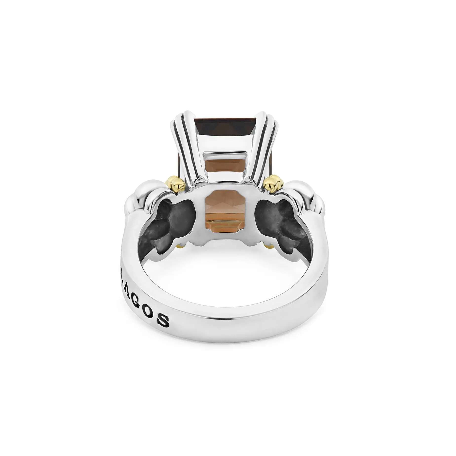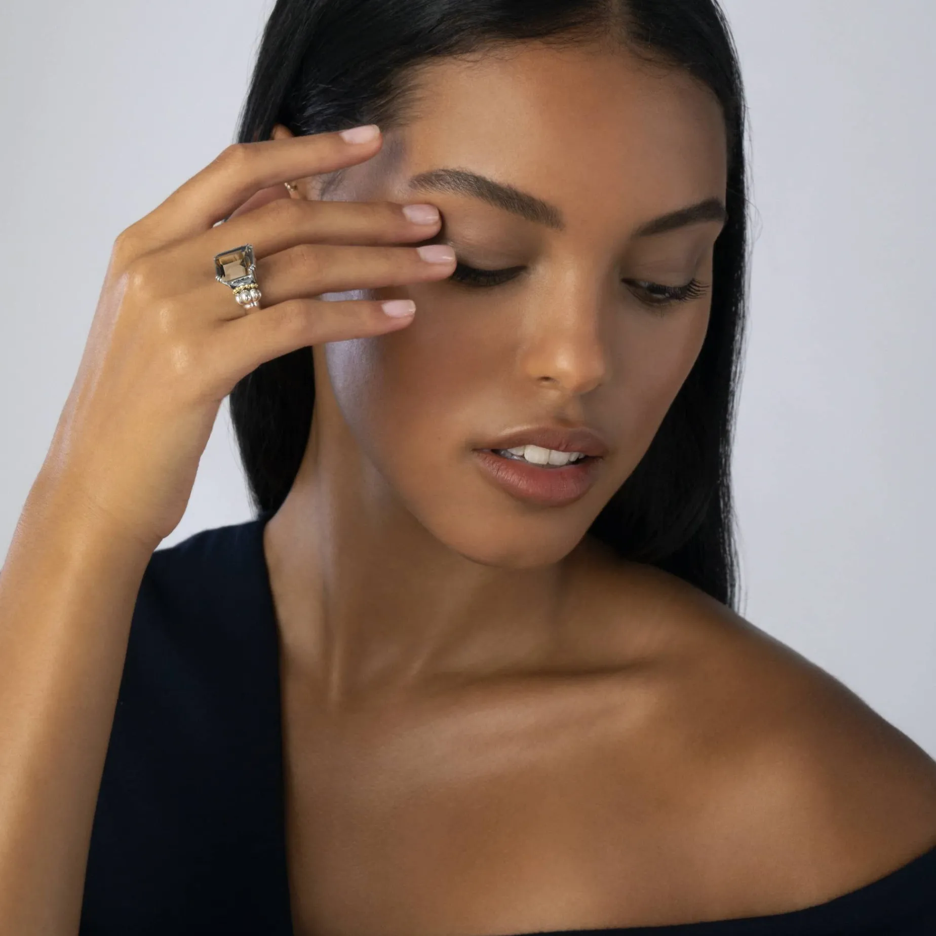 The Return Of A Lagos Icon. Our Signature Emerald-Cut Smokey Quartz Gemstone Ring With A Prong Setting In Sterling Silver And 18K Gold Caviar Beading.