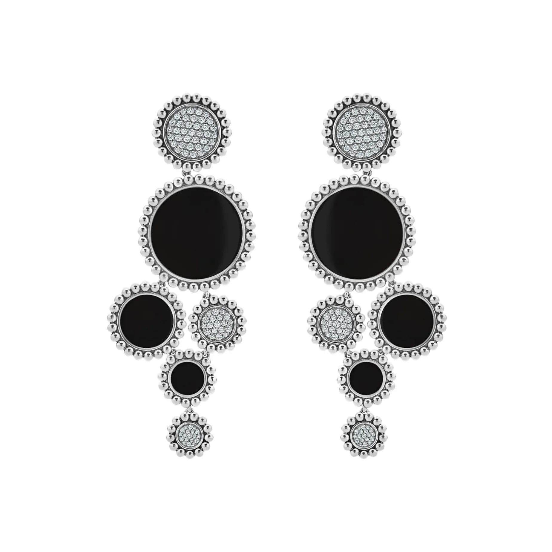 Diamond And Onyx Circle Statement Drop Earrings Framed By Sterling Silver Caviar Beading. Onyx Is A Natural Deep Black Stone. Lagos Diamonds Are The Highest Quality Natural Stones.