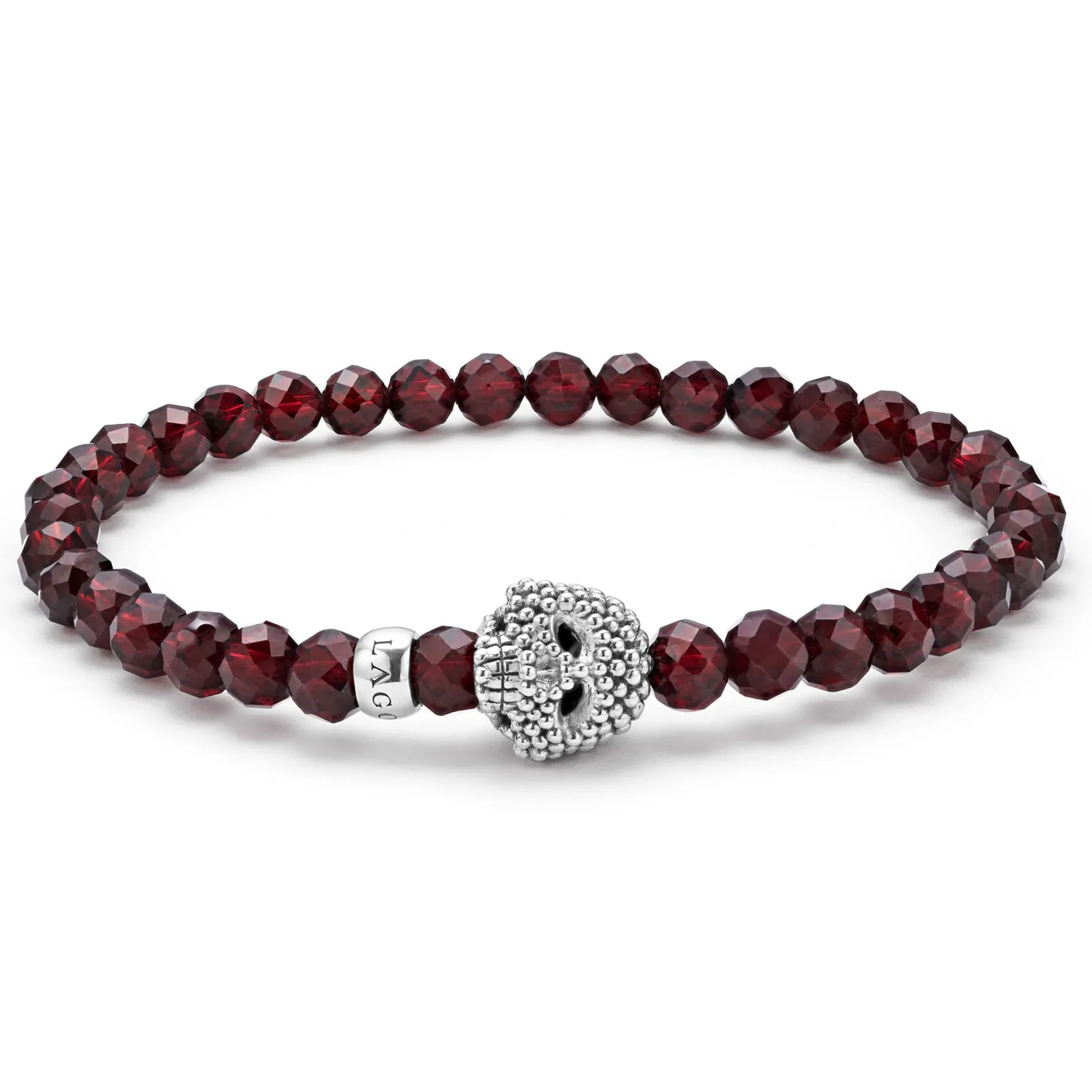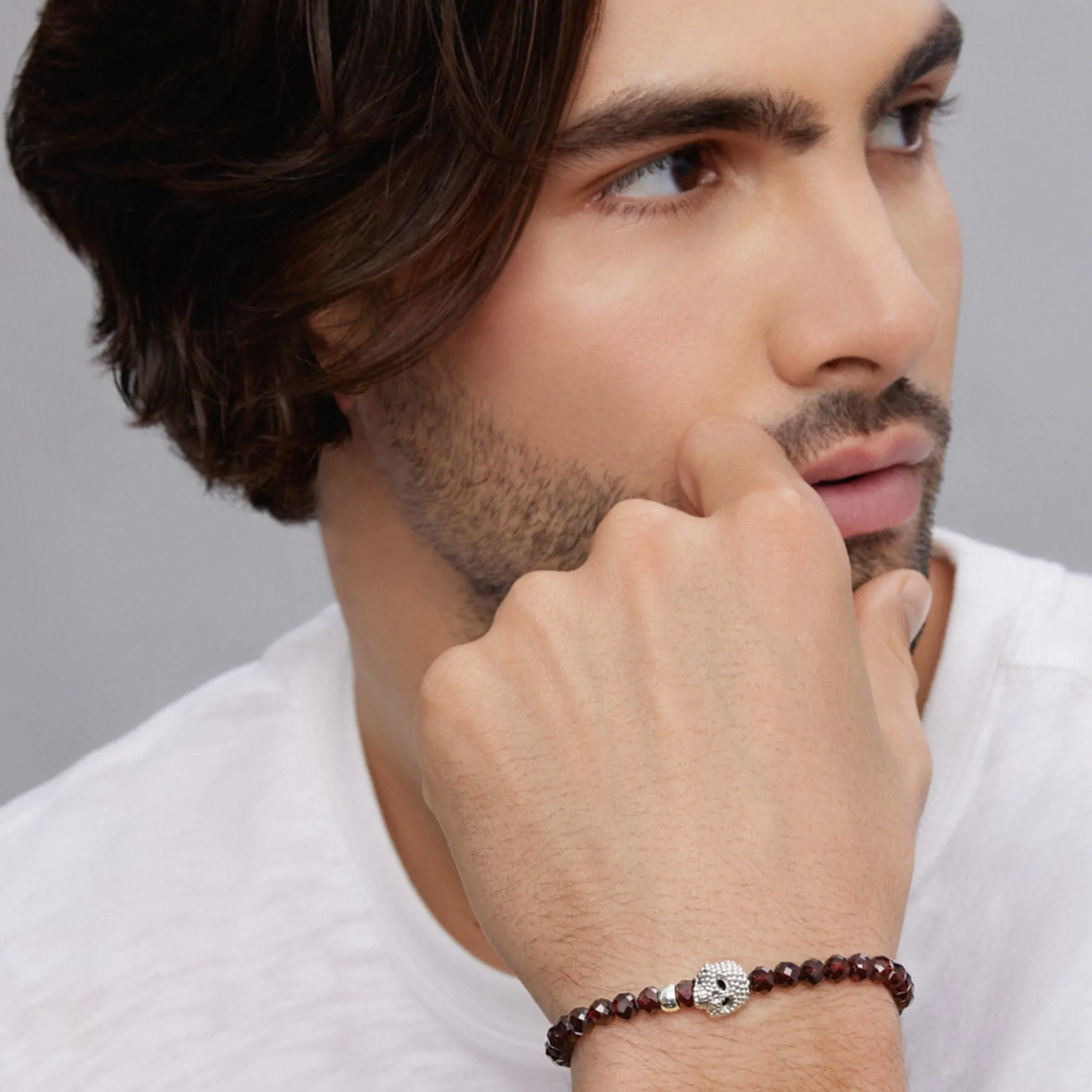 Red Garnet Gemstone Bracelet With A Sterling Silver Caviar Skull. The Stretch Fit Accommodates Most Wrist Sizes.