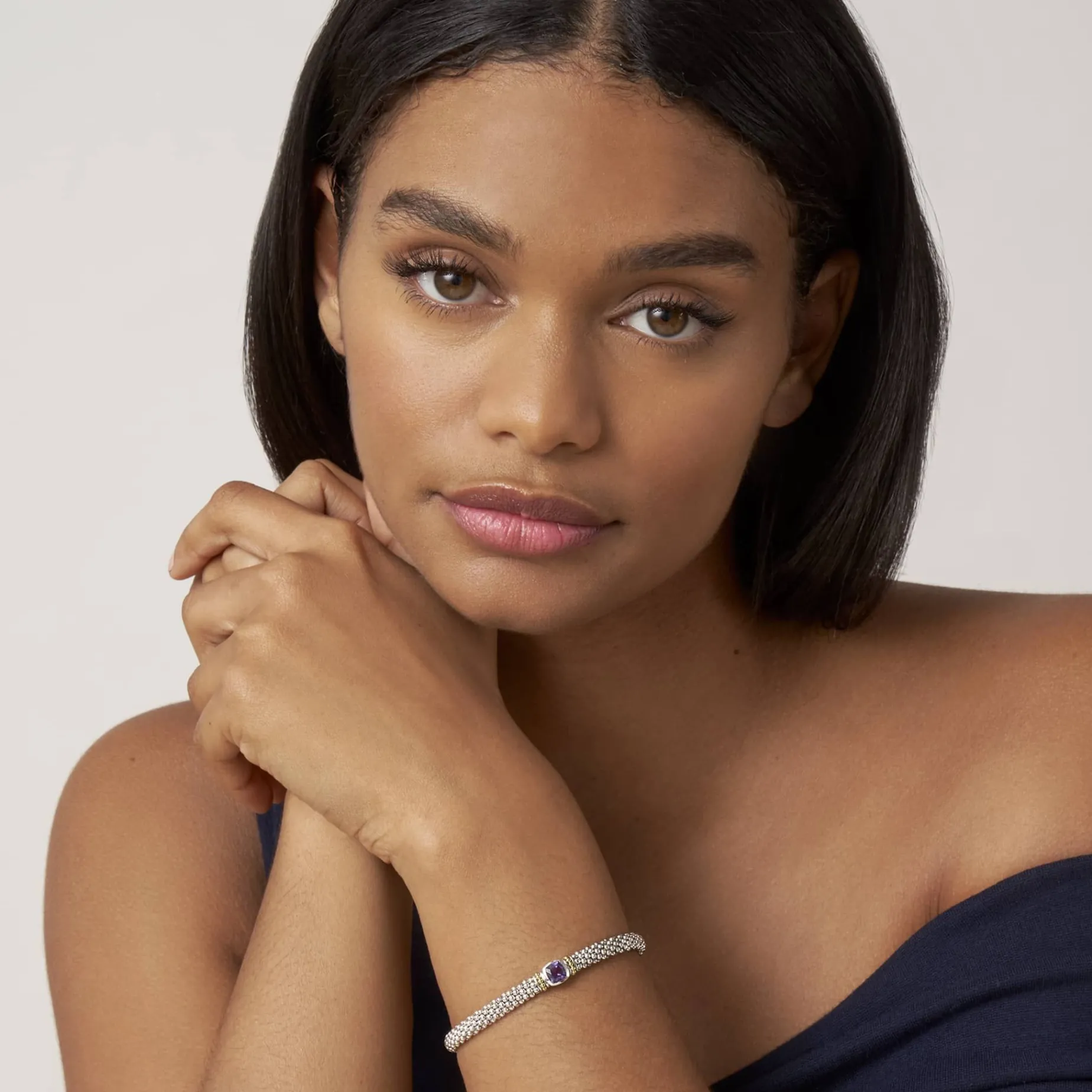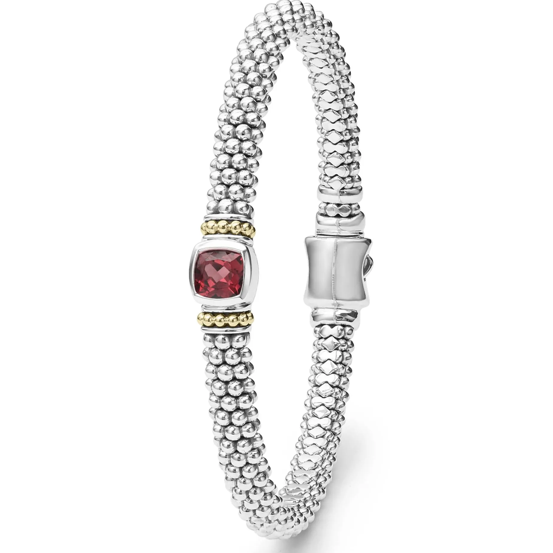 A Rhodolite Garnet Gemstone And Sterling Silver Caviar Beading With 18K Gold Detailing Forms This Bracelet.
