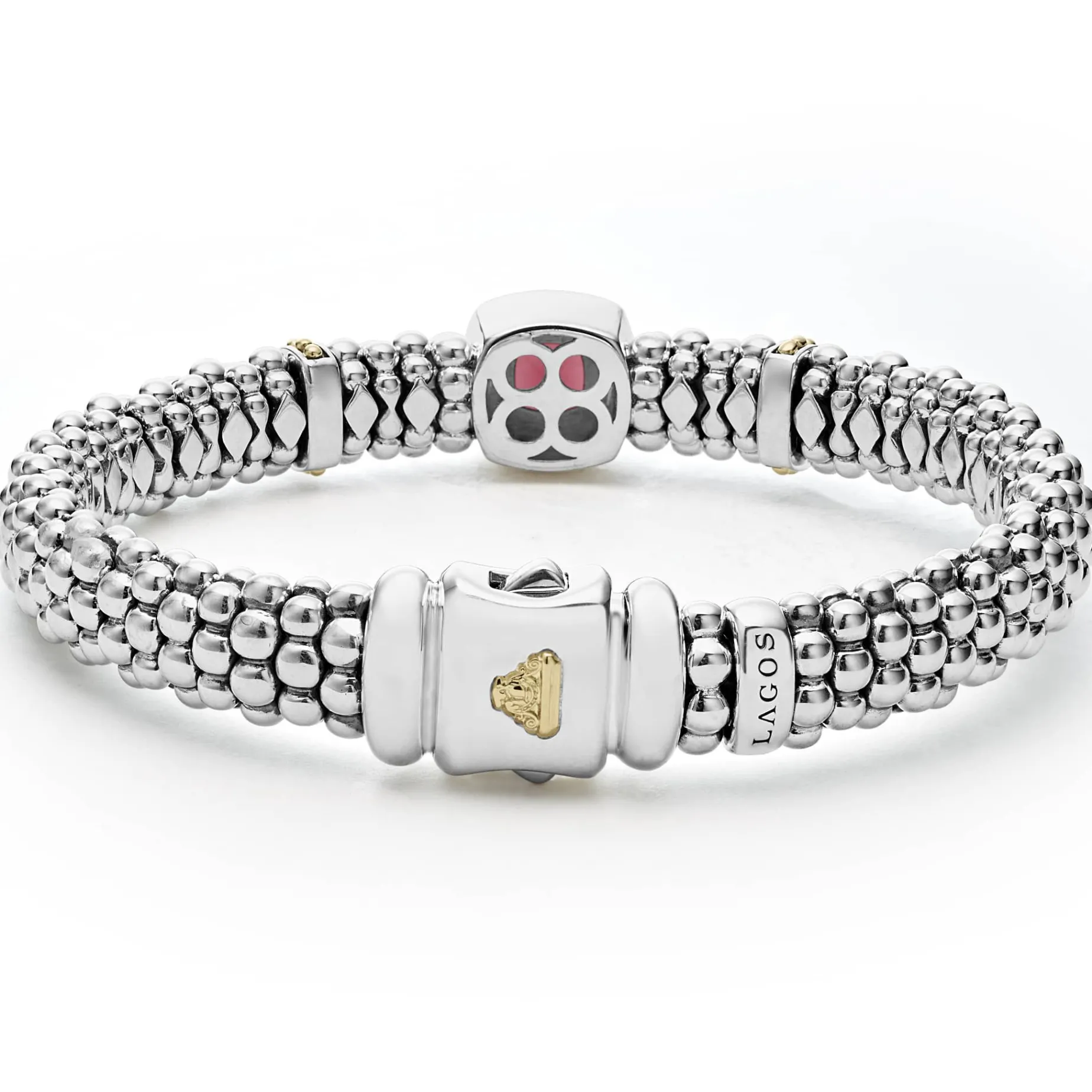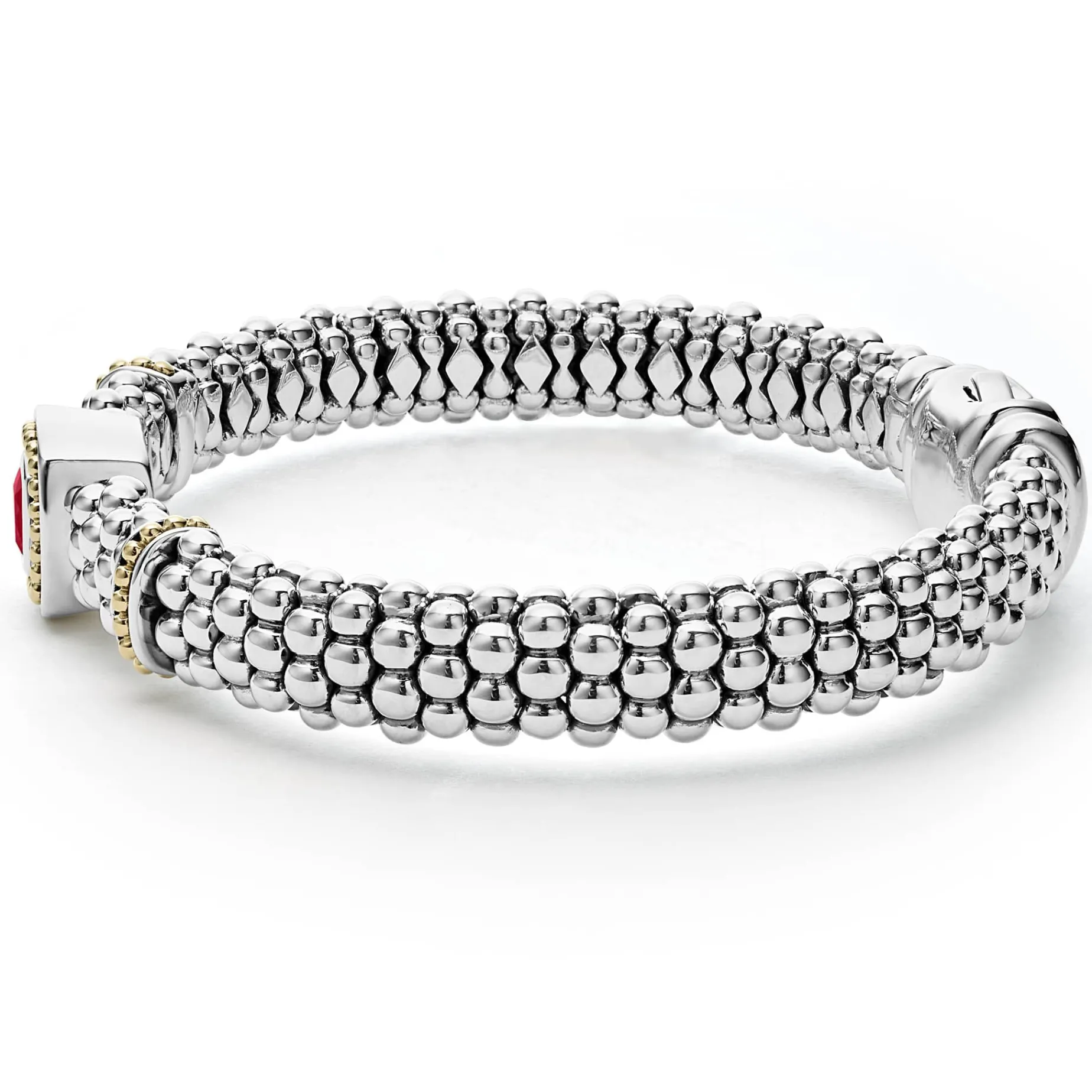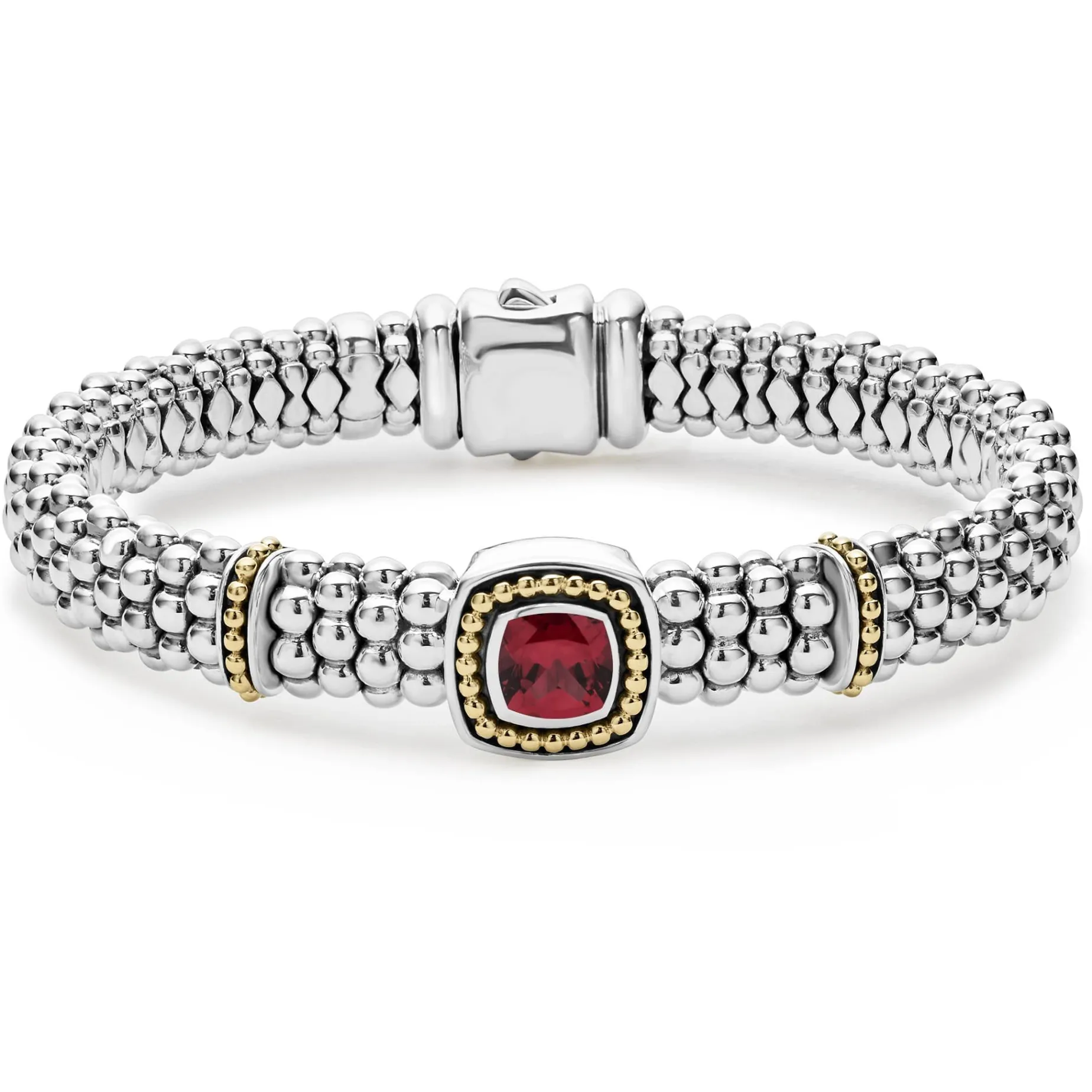 A Rhodolite Garnet Gemstone And Sterling Silver Caviar Beading With 18K Gold Detailing Forms This Bracelet.